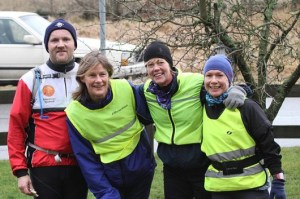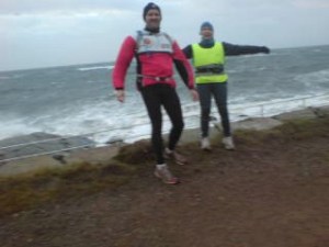 Sprang hemifrån och in mot Falkenberg för att möta de övriga löparna i Sverigestafetten. Det var fyra stycken som startade från Falkenbergs station och kom springande norrut. Mötte upp dem vid torsåsen och sprang vidare norrut. Mellan Glommen och Sandkärr hade Jim lämnat sin cykel och en väska med varm kakao och glögg samt lite frukt mm. Efter det stoppet så lämnade Jim oss och vi fortsatte norrut ut mot gamla E6:an. När vi kom fram till Galtabäcks IP så stannade vi till och fikade lite med kaffe och bullar. Där lämnade Karin oss och jag, Marie och Lena fortsatte norrut. Det var lite jobbigt at få upp värmen igen efter stoppet, vädret var ju inte det bästa heller med +5 grader 10-14 m/s och småregn. Sprang genom läjet och ut över södra näs och genom apelviken. Sedan var det bara strandpromenaden kvar innan vi sprang upp till borggården på Varbergs fästning. Nu var vi klara med denna veckas etapp och jag sprang vidare till svärfar för att byta till torra kläder och åka med familjen hem.