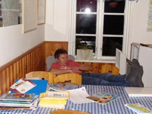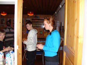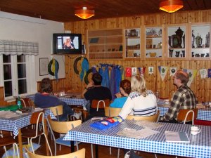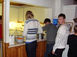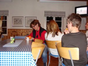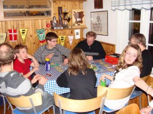 Sedan var det dags att förbereda kvällsmaten som bestod av köttbullar med potatis och sallad. alla var lite trötta efter dagen och vi satt i stugan och såg på melodifestivalen medans några spelade spel.