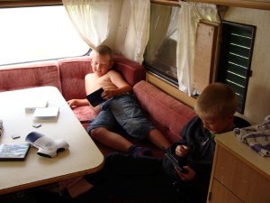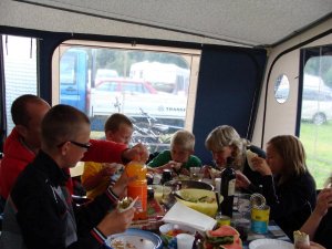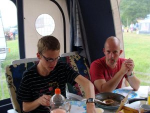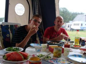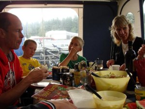 Efter detta så fick jag ta en dusch liggande eftersom pumparna var avstängda. Men efter en hel del skratt så var jag och Johan duschade och gick tillbaka till husvagnarna för att äta lite gott.