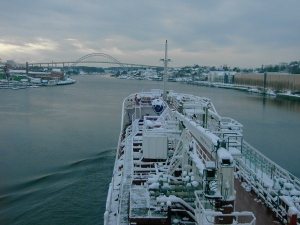 Vaknar vid 06:50 och hör att de har börjat lossa. Ner i mässen och tar en kopp kaffe innan frukost.