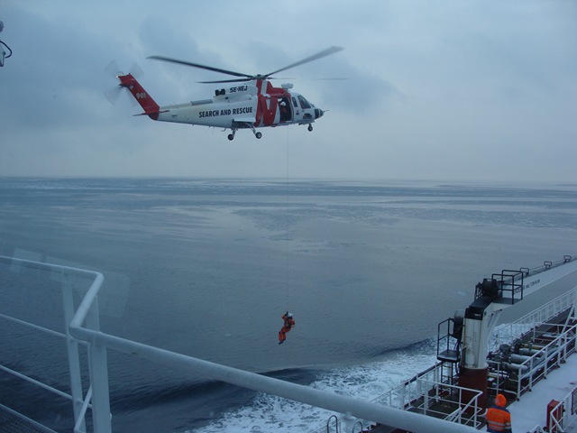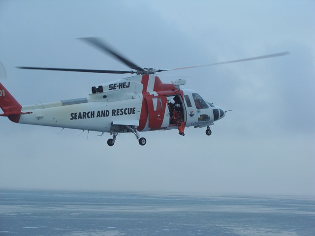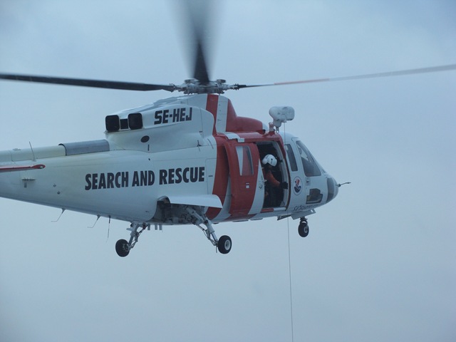 När vi är 6 nautiska mil från Vinga så kallar sjöräddnings helikoptern upp oss och undrar om de får öva med att hissa ombord folk. Självklart tycker vi att det går bra och får se en fin uppvisning av en duktig pilot.