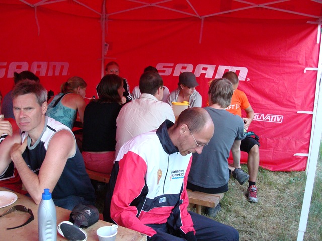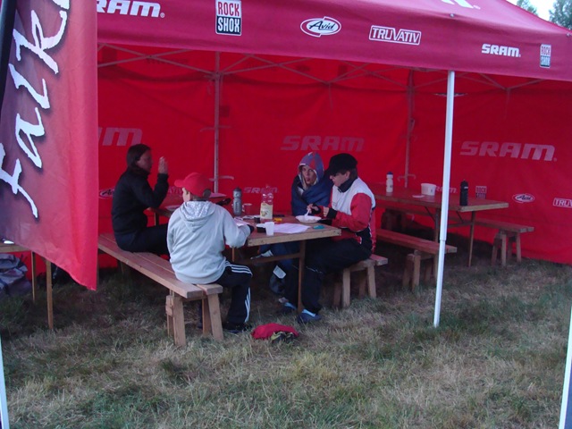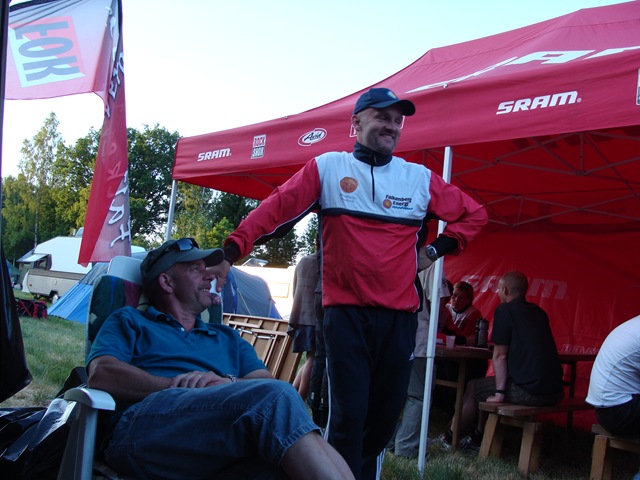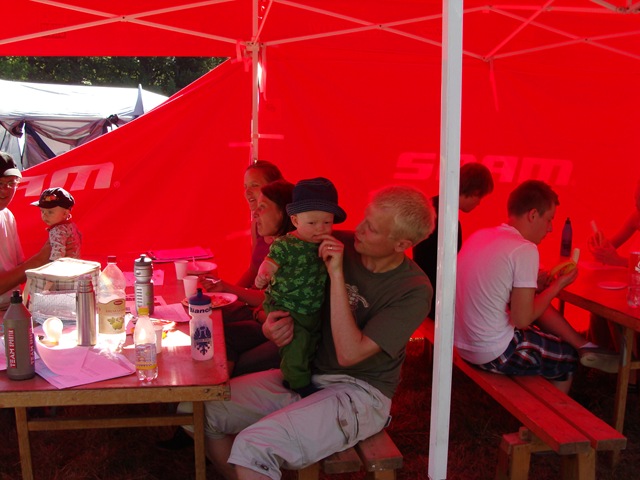 När tävlingarna pausas efter 7 sträckor så ligger lagen på 30 respektive 55 plats. Vi går nu tillbaka till campingen och äter lite pastasallad.