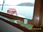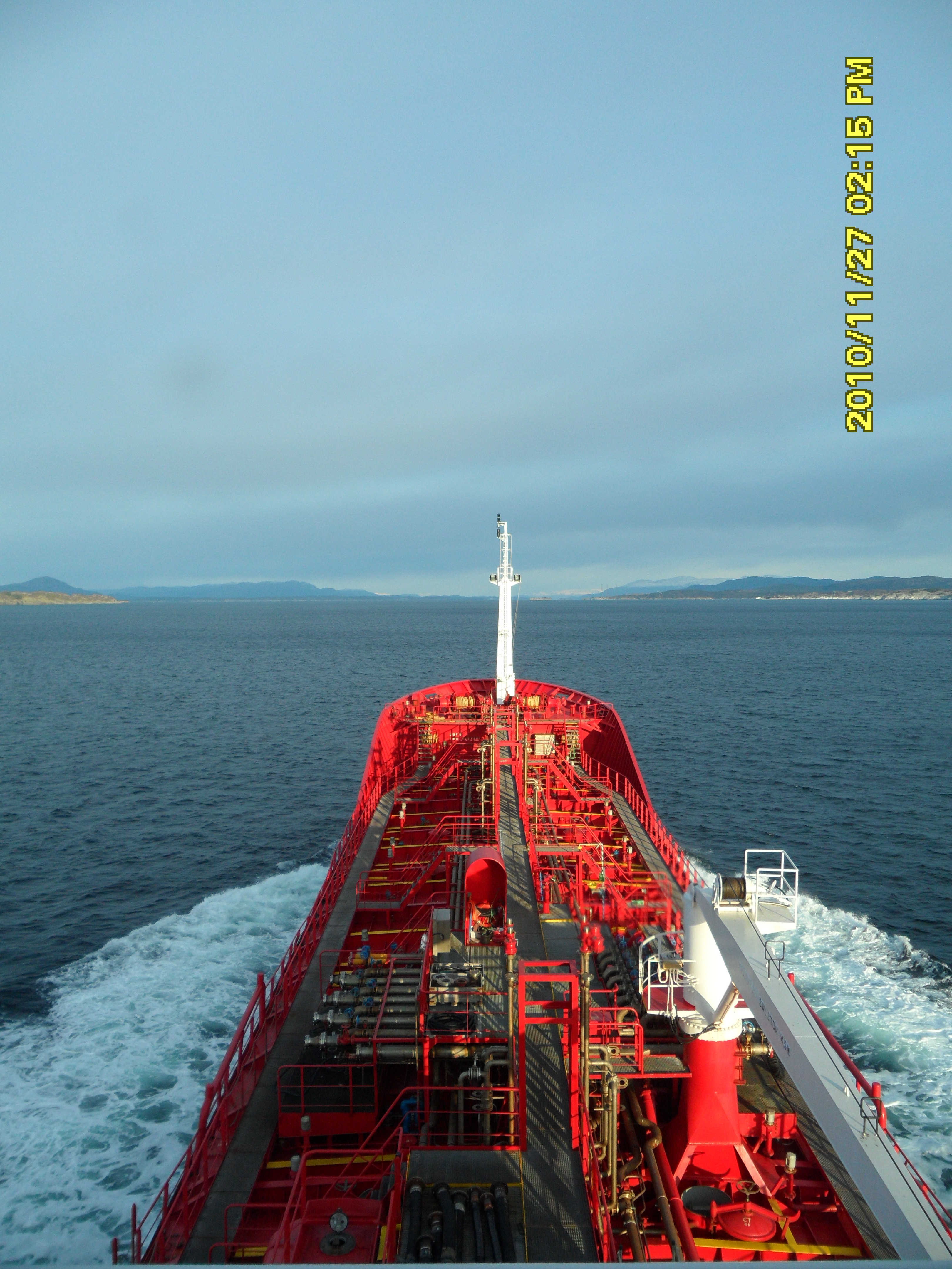12:20 Avgår från Lillesund och sätter kurs mot Mongstad. Går nordöver och vid tretiden så kommer matrosen upp med nybakta wienerbröd och färskt kaffe. Skönt att sitta här uppe och köra båt när det är så kallt ute.