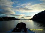 05:00 Förtöjda i Förde för lossning. 0 grader och snöfall.