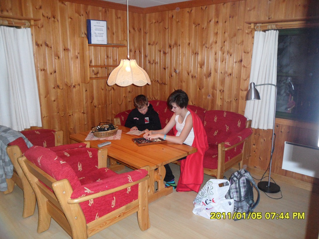 17:15 Framme i Orsa Grönklitt och tar oss upp till vår stuga. Vi packar in våra saker innan jag, Britta och Elin går en runda för att se om vi kan hitta en affär. Linnea och Oscar stannar kvar och spelar lite spel. Vi hittar en butik och väl tillbaka i stugan så ger jag mig ut på en liten runda i elljusspåret för att prova skidorna.