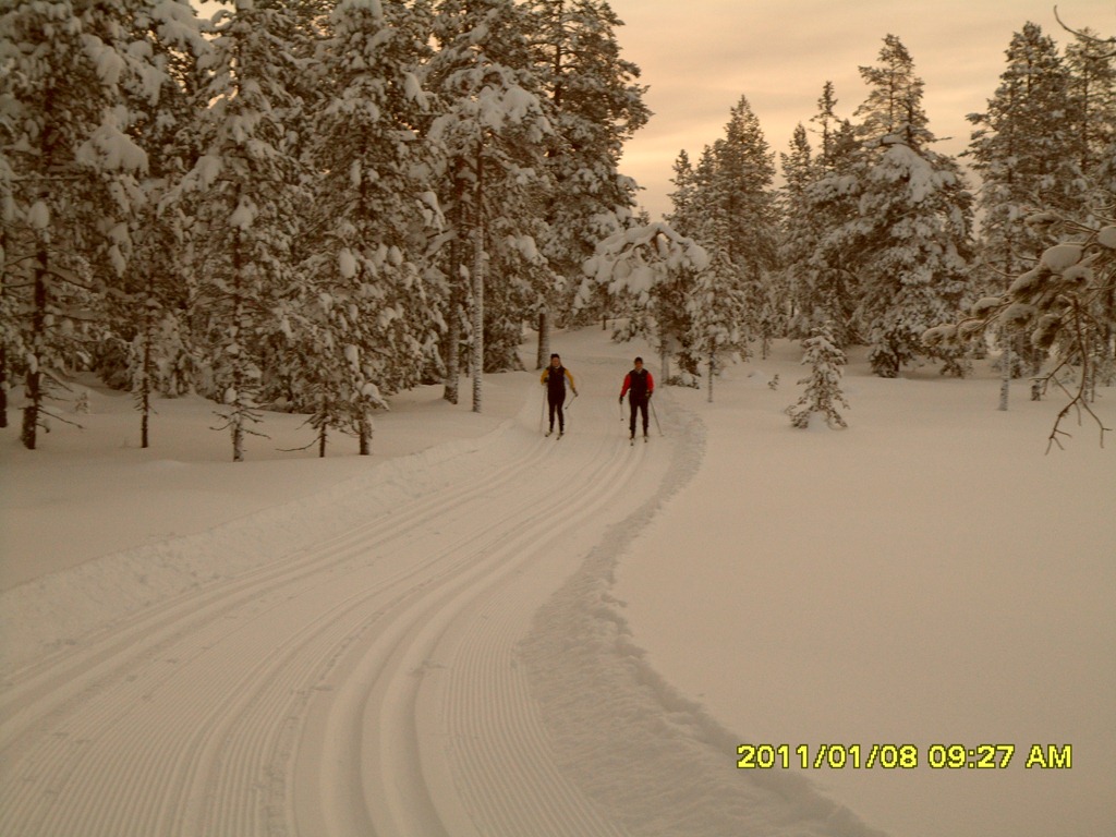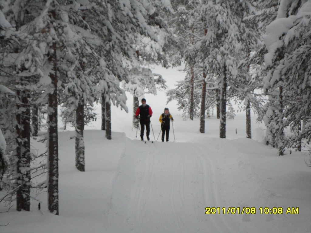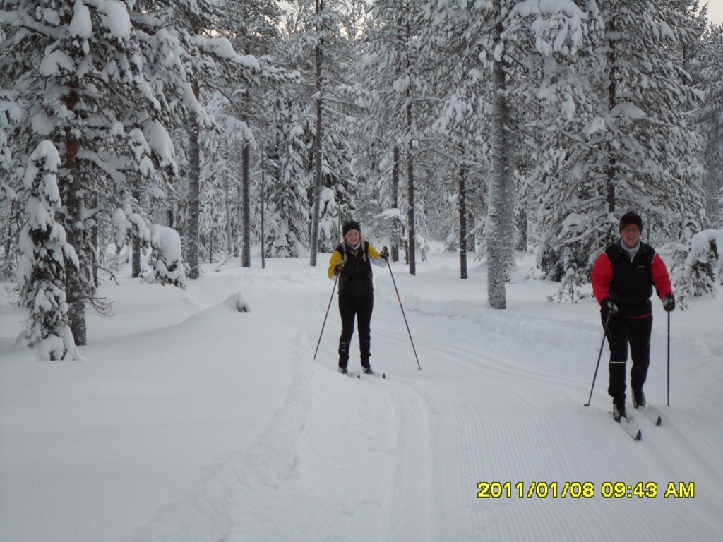 Vaknar till en kall dag –18 grader. Jag, Britta och Elin pälsar på oss för att åka 10 km spåret. Linnea och Oscar ville gå bort och åka pulka och skidor i backen.