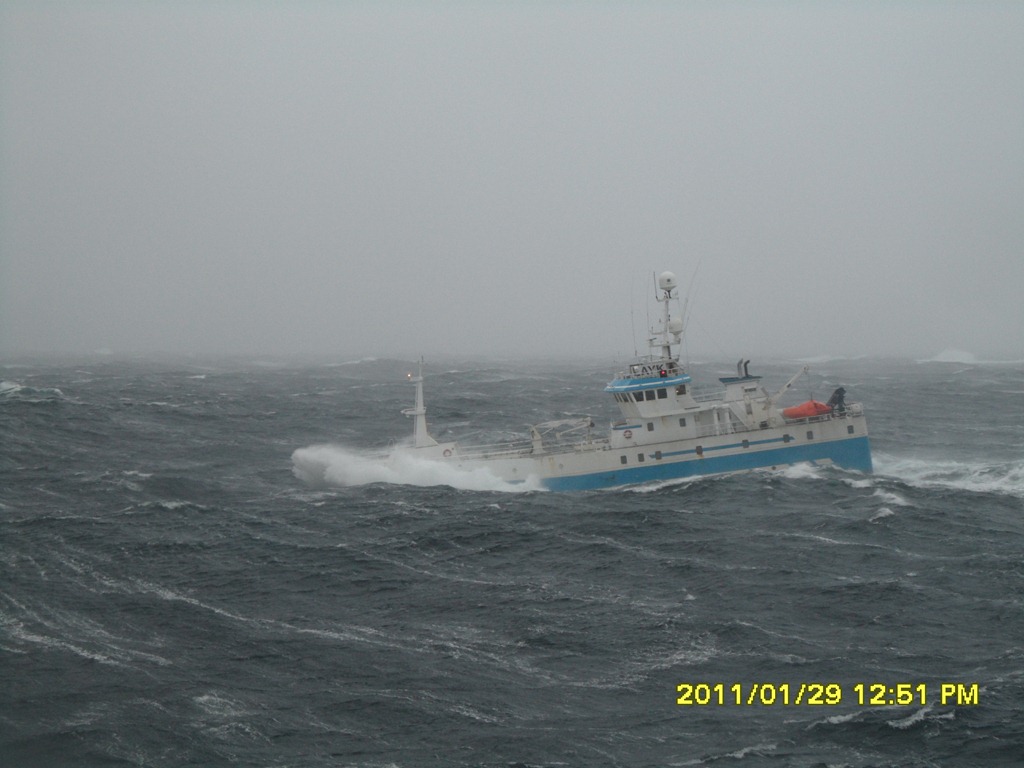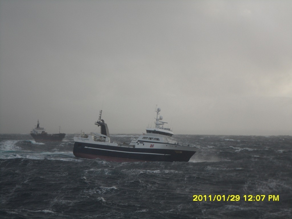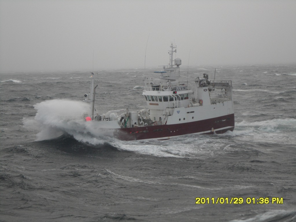 12:00 Kommer på vakt precis när vi ska runda Kolbeinsflua och ge oss ut på Hustadvika. Det blåser nu 20 m/s västligt och båtarna vi möter har det kämpigt i den grova sjön. Men för vår del så går det bara fint.