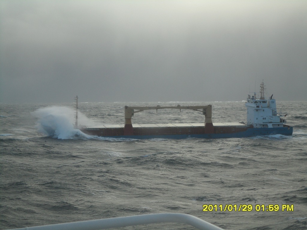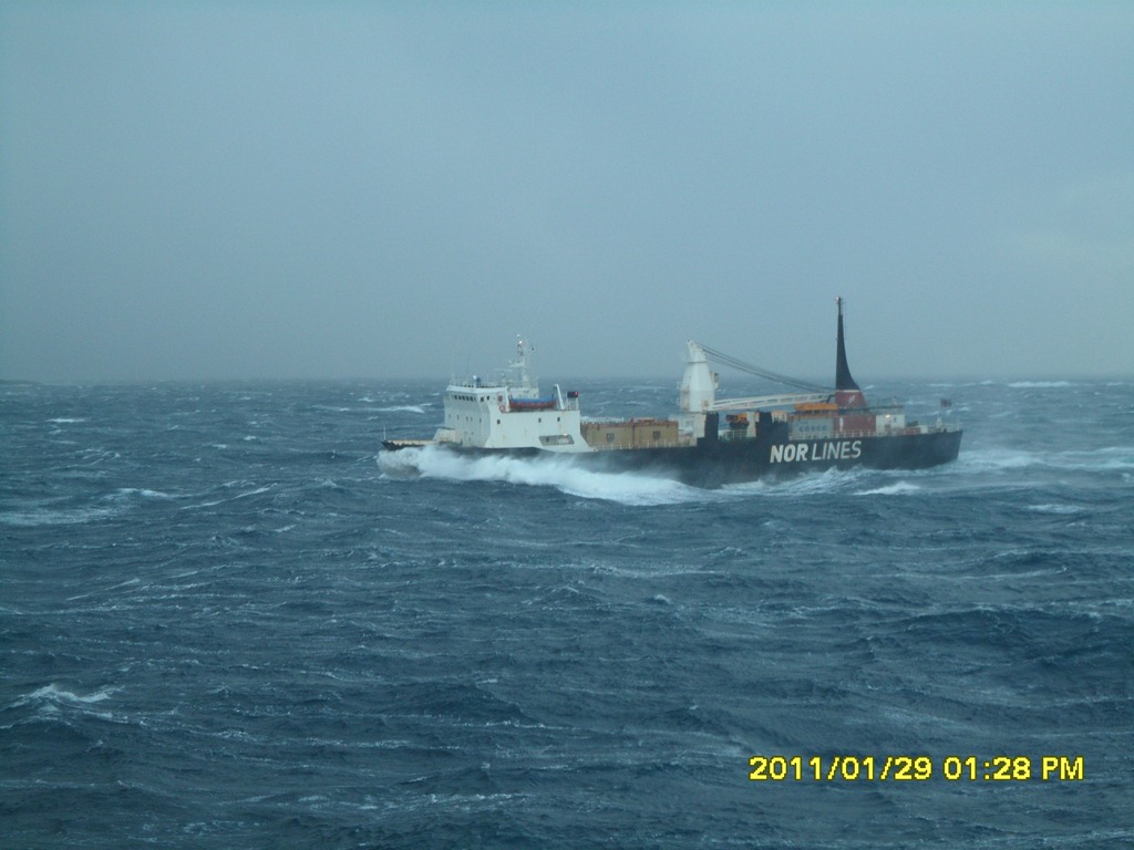 00:00 Kommer på vakt en bit innan Askvoll. Ser på AIS att vi kommer få möte med Isafold i den smalaste biten vid Askvoll så jag slår av på farten och låter de passera först. Fortsätter upp förbi Florö och när vi närmar oss Målöy så blåser det 26 m/s sydlig vind och ösregnar. Kommer ut förbi Skongenes men det rullar inte så farligt. När vi rundar Stadt så får vi sjön in akterifrån så vi väljer at fortsätta mot Flåvärsleia.