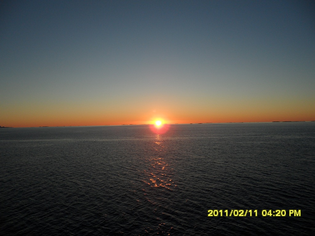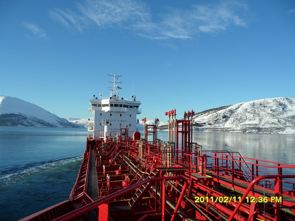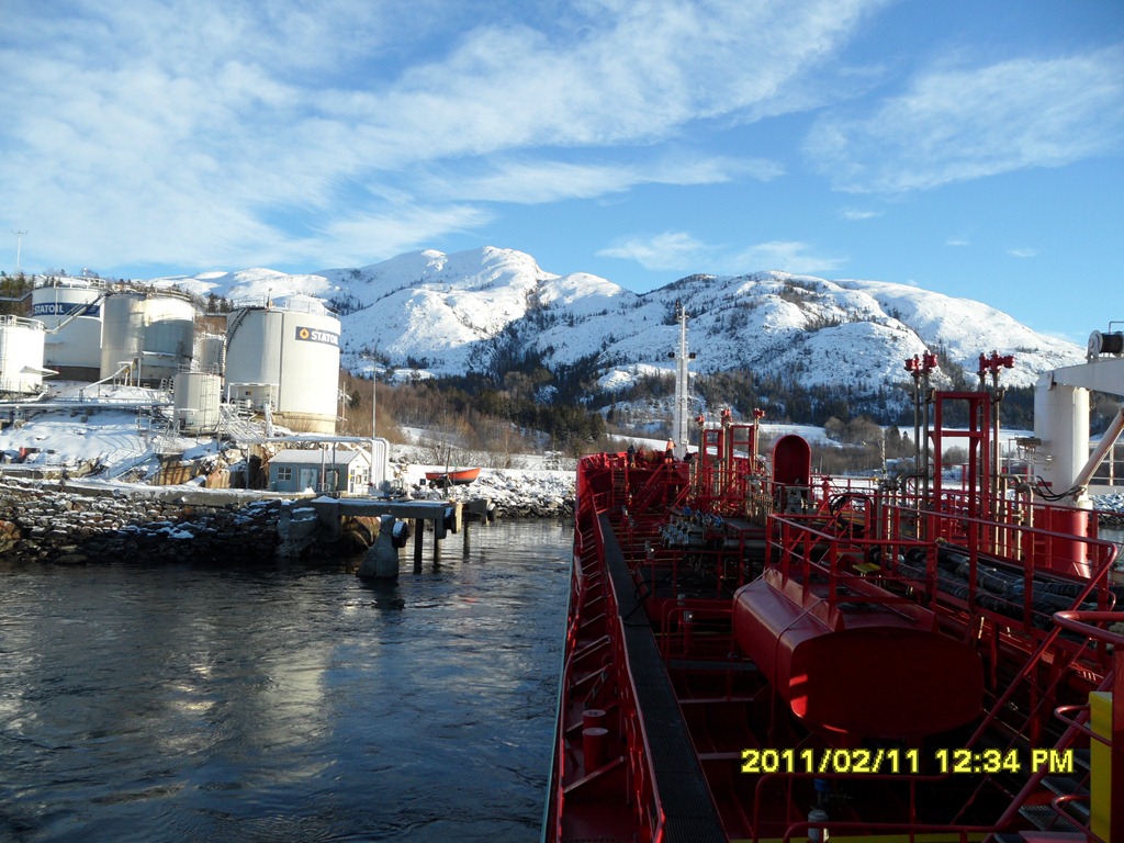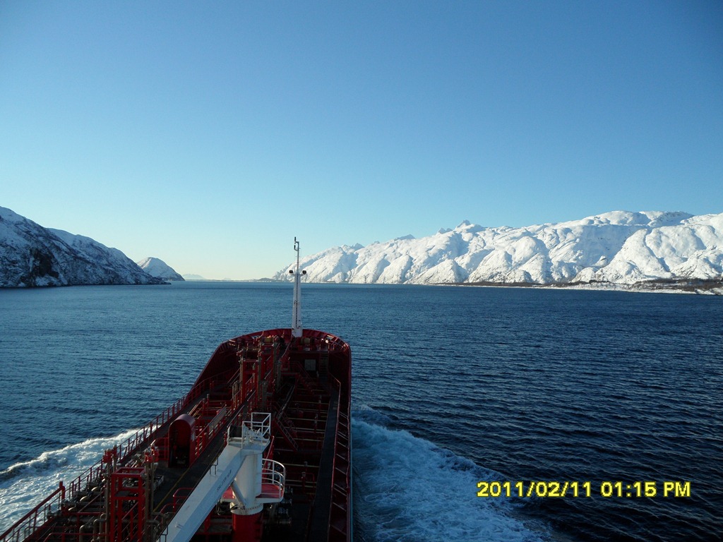 12:35 Färdig lossade och avgår mot Mongstad. Går ut genom Vefsnfjorden. Vindstilla solsken och –6 grader.