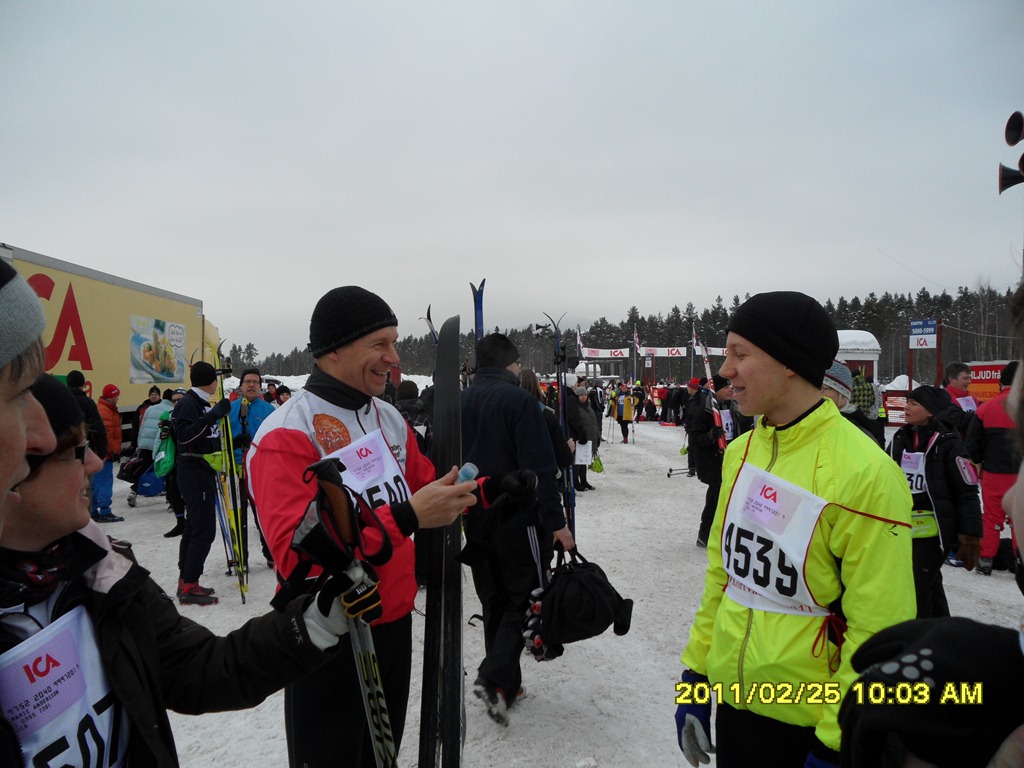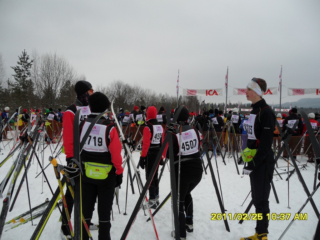 11:00 Starten går och vi tar oss sakta men säkert fram uppför första backen. Ganska trångt så det går sakta i början. Jag och Elin ligger sist av oss men vi har bra fäste och hyfsat glid.