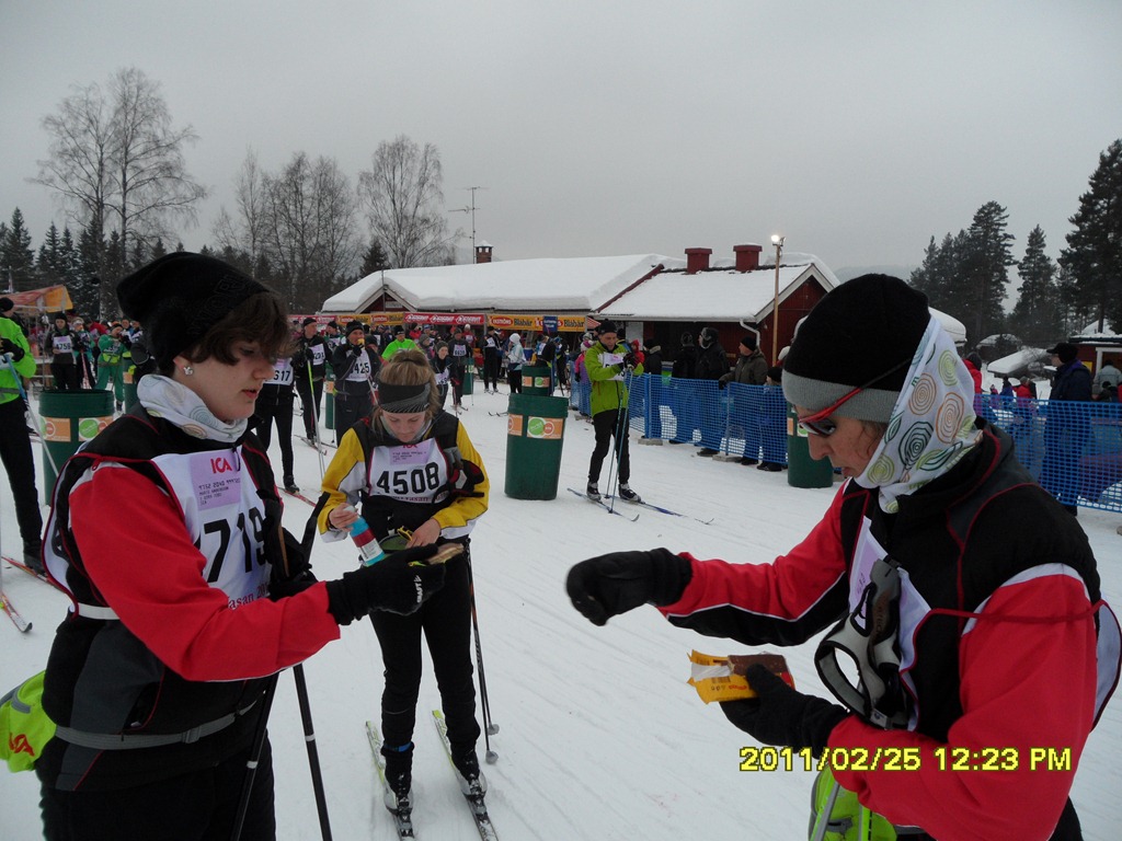 Britta åkte nu vidare själv medan Linnea hade följe med Anna. I den första utförsbacken efter Hökberg så gjorde Elin sin första vurpa, men det var pga att en tjej före ramlade och låg tvärs över spåret. Elin klarade alla backarna bra förutom där det var folk som ramlade framför oss. Men orken började tryta efter 15 km och vi märkte hur de andra drog ifrån oss.