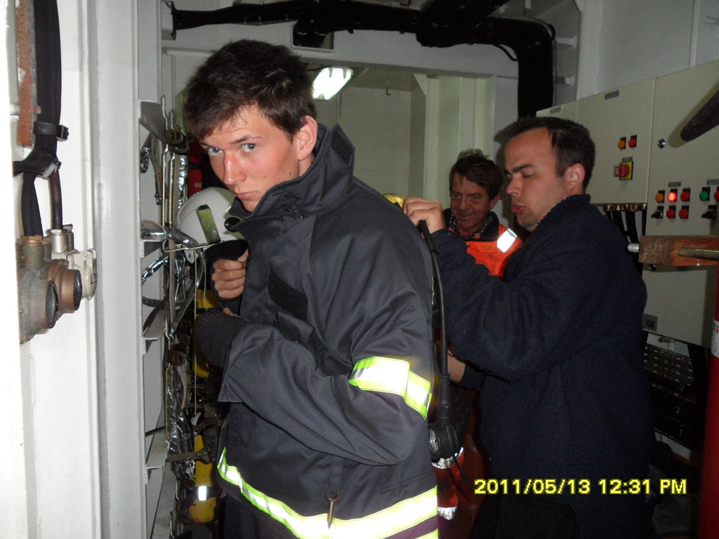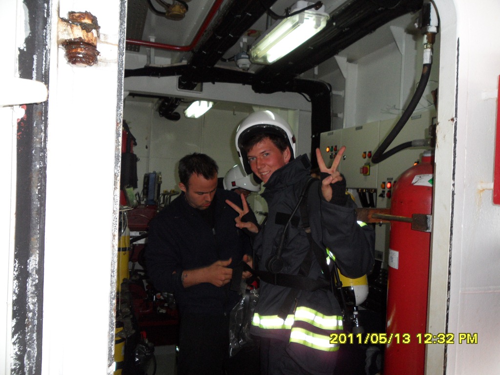 12:00 Kommer på vakt NV Ålesund, vi går på utsidan idag och det är alldeles stilla men regnar lite. Vi genomför en liten brandövning där de tar på sig hela rökdykar utrustningen och sedan provkör vi skumkanonerna. Sedan blir det genomgång och mönstring i livbåten samt genomgång av procedurer vid Man över bord och sjösättning av MOB båt. Vi avslutade med ett säkerhetsmöte på bryggan.