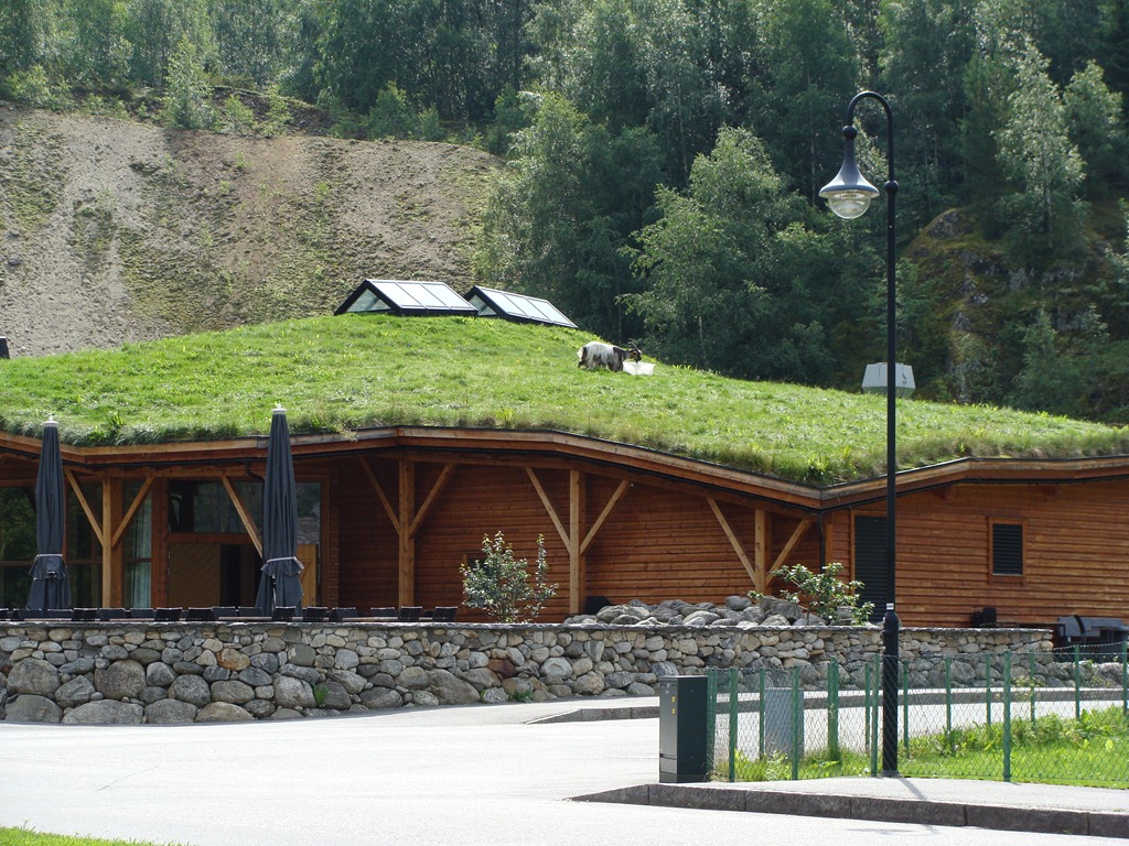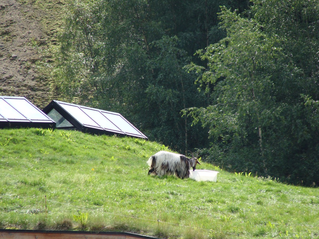 När vi sedan kom ner till Eidfjord så stannade vi för att äta lite. Där gick getterna och åt på taket….