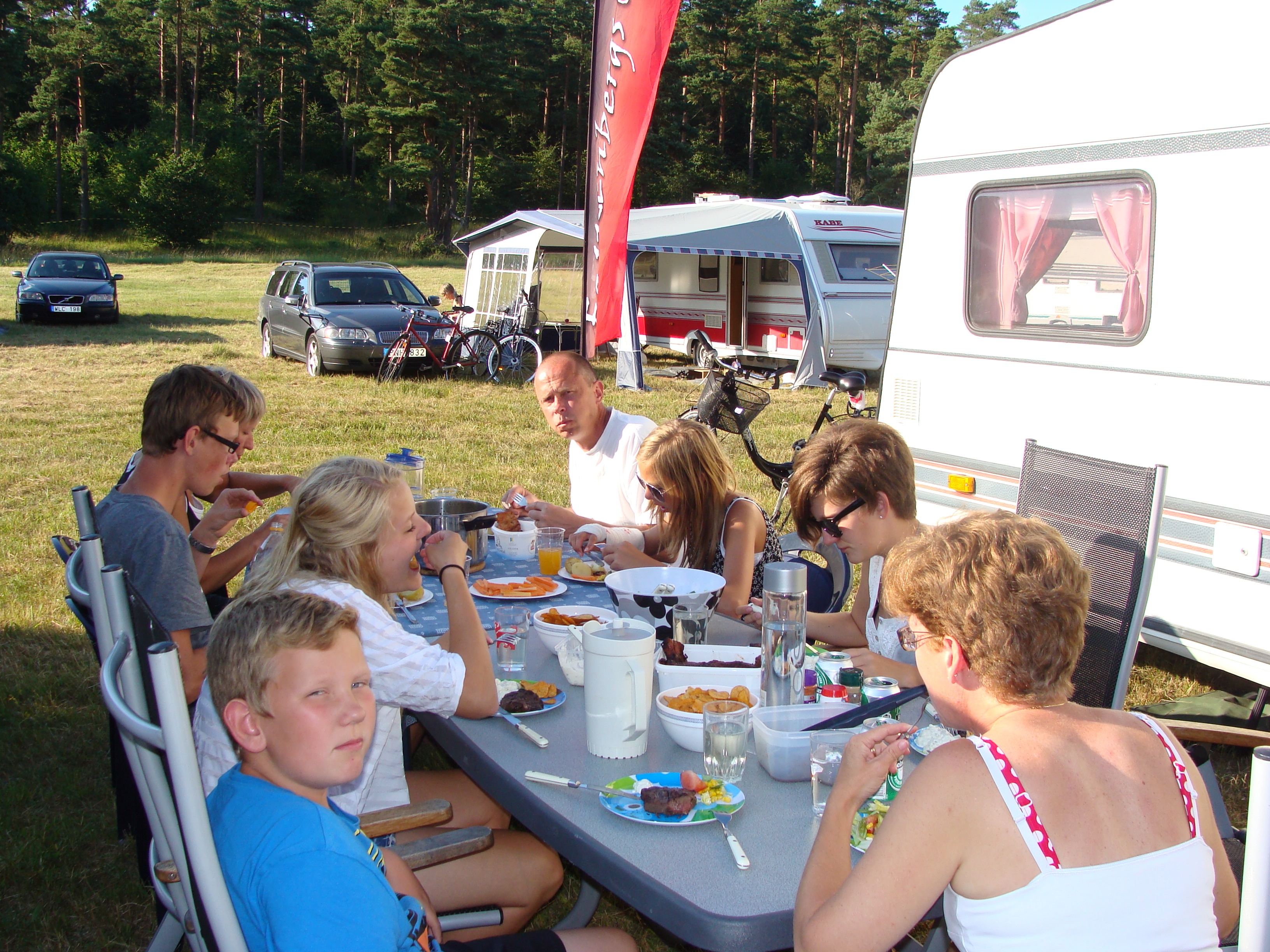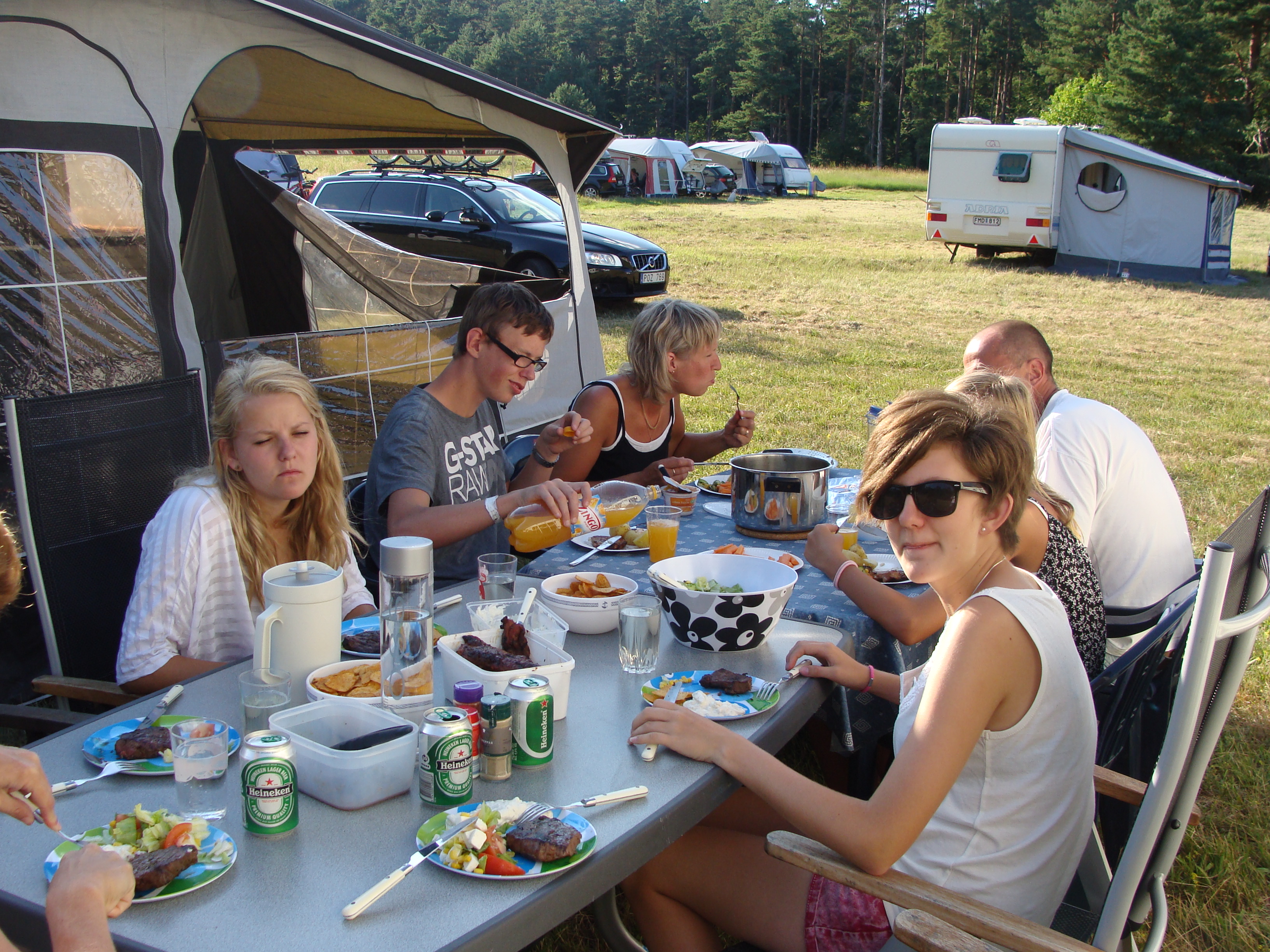 Sedan hade Britta och Anna dukat långbord mellan husvagnarna och vi satte oss till bords för att äta. Britta och barnen fick för första gången i sina liv smaka på valbiff vilket alla utom Linnea tyckte var gott. Till dessert så åt vi jordgubbar med grädde.