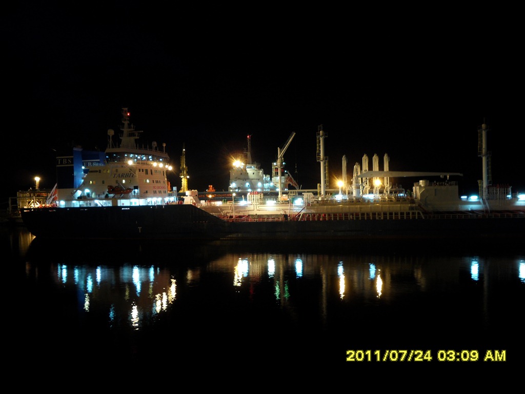 11:00 Lämnar kaj för att låta en gastanker ta bunkers. Vår produkt är inte klar ännu så vi lägger oss i fjorden och driver.