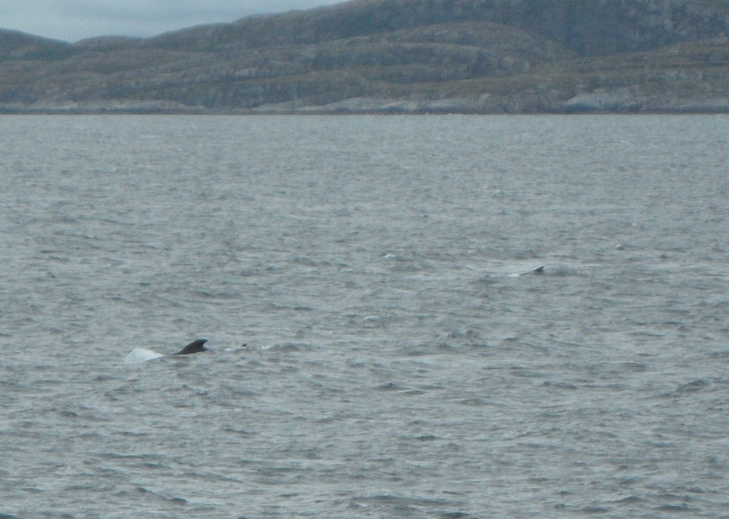 14:00 Kommer på vakten när vi snart skall lämna Folda och gå in mot Rörvik. Då får jag se ett stort stim med grindvalar som simmar en bit ifrån oss.
