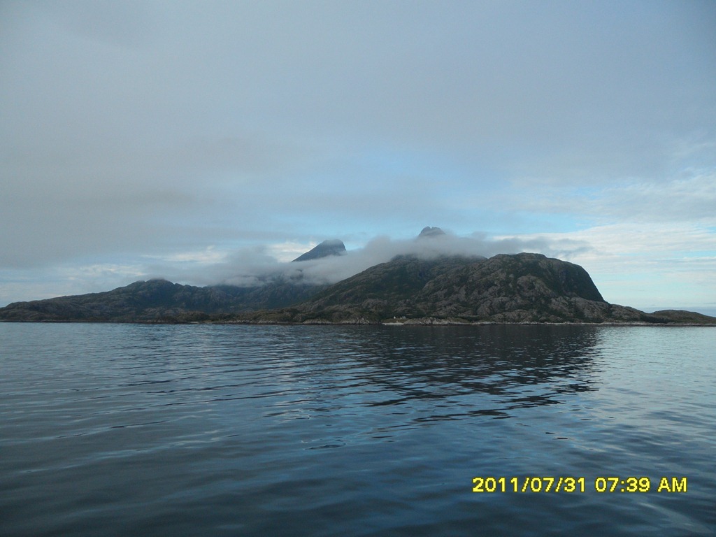 14:00 Kommer på vakt när vi passerar polarcirkelöya Vikingen. Fortsätter söderut och sedan in genom Ranafjorden.
