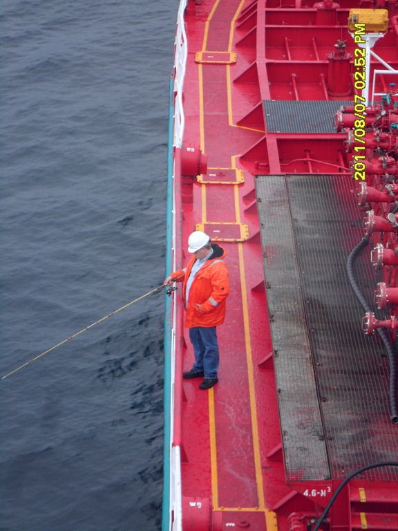 14:00 Kommer på vakt och fortsätter lastningen. Per skyndar sig ner för att äta eftersom han vill se om han kan få mer makrill. Han hade fått en när vi låg till ankers.