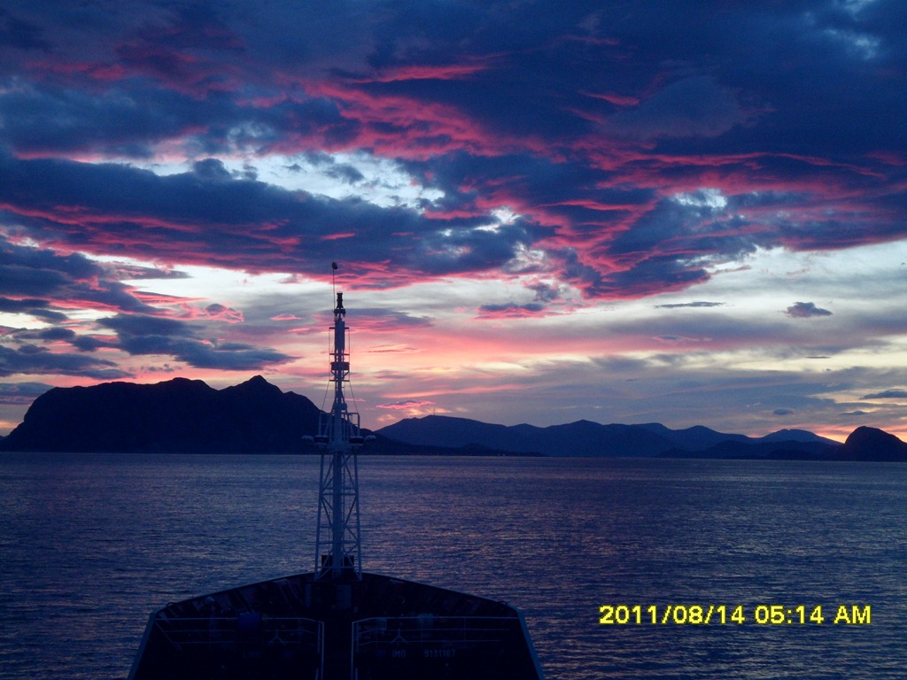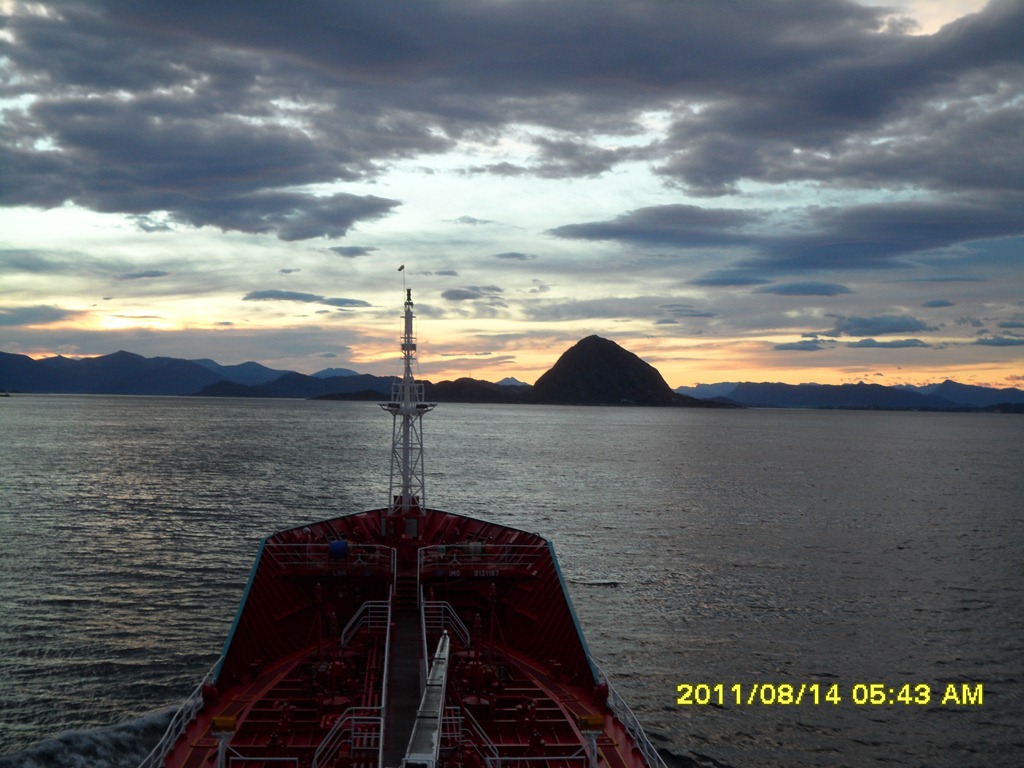 02:00 Kommer på vakt vid Gamle Lysböye och därefter rundar vi Stadt i fint väder. Nästan vindstilla och +17 grader. Vidare in genom Flåvärsleia och förbi Ålesund.