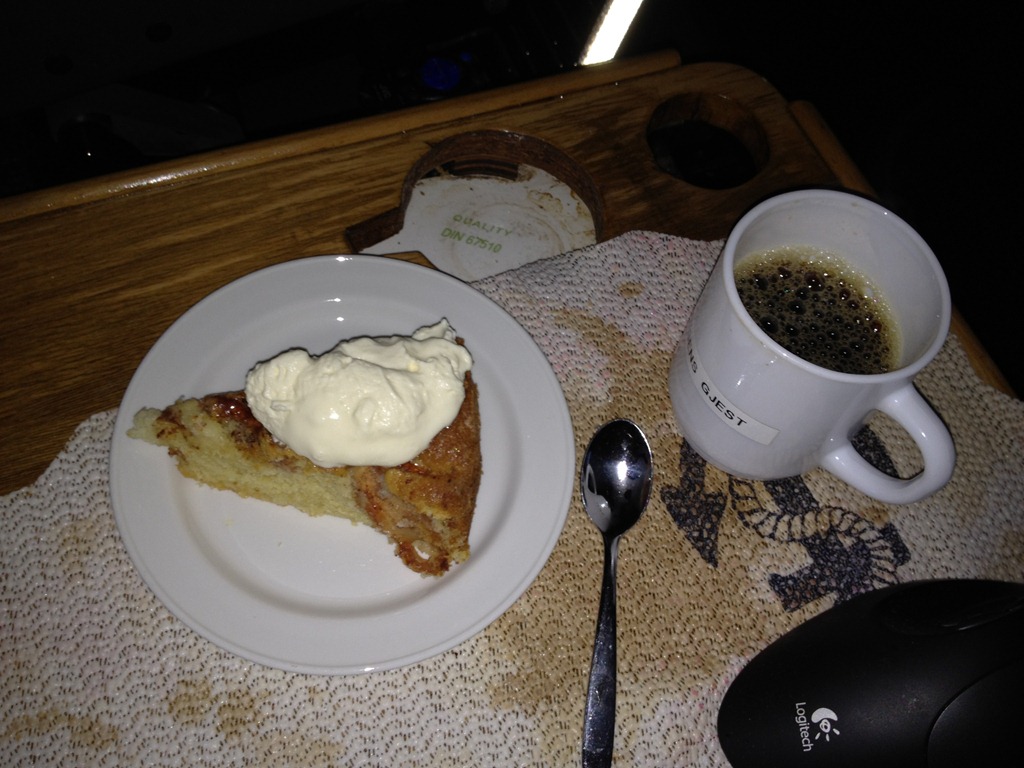 14:00 Löser av Per på bryggan när vi är på väg in i Skatestraumen. Fortsätter söderut i ett tråkigt disigt väder. Men vi bjuds på äppelkaka till kaffet vilket livar upp stämmningen lite. ![]()