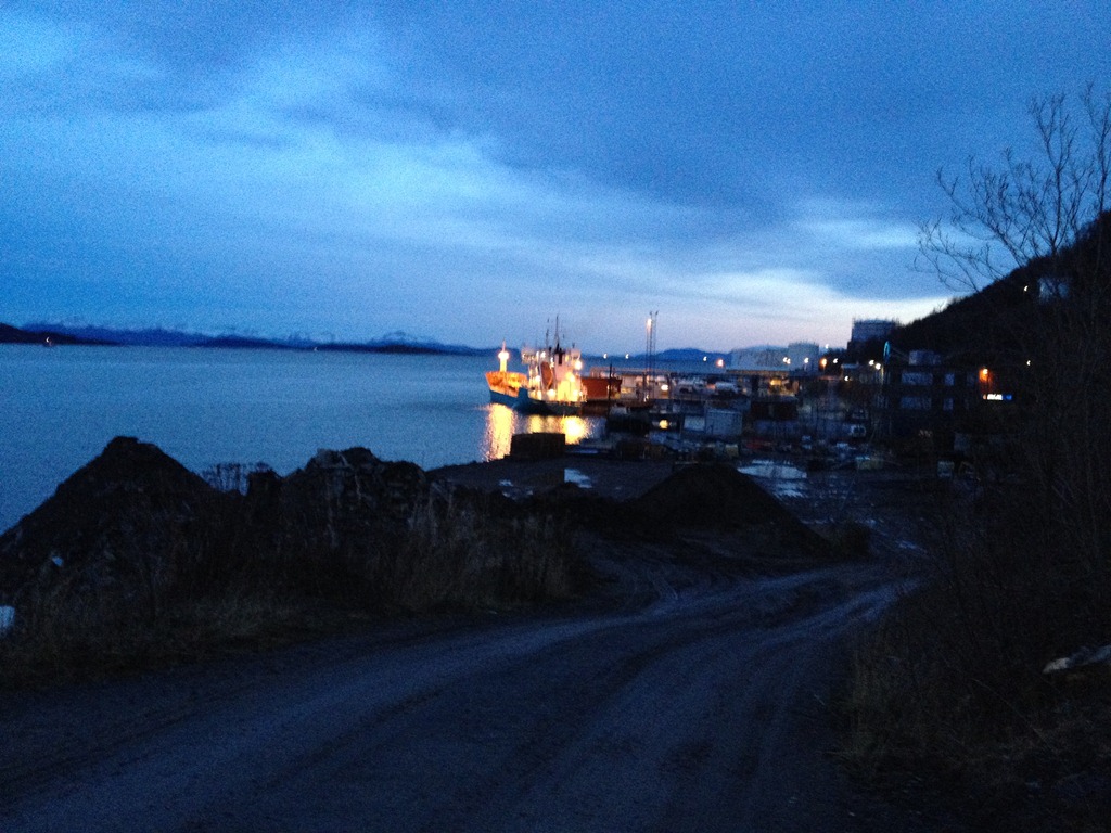 08:20 Förtöjda på Gangsås i Harstad för lastning. Jag tar på mig och springer en runda för att få komma i land lite och röra på benen. Det blir 7 km på 42 minuter i ett lungt behagligt tempo. När jag kommer tillbaka så börjar det ljusna och klockan är 9:30.