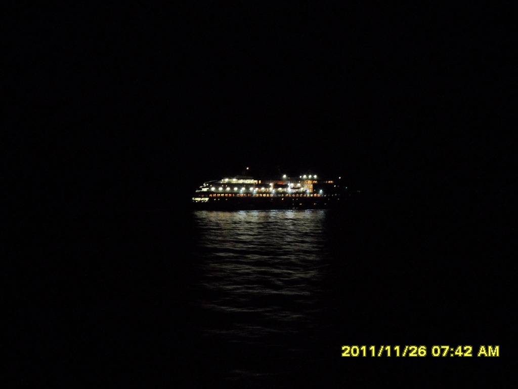 Vi fortsätter genom Gisundet och har reducerat farten lite för att passa in anlöpet i Harstad till 08:00. Strax innan vi är framme så passerar Hurtigruta oss.