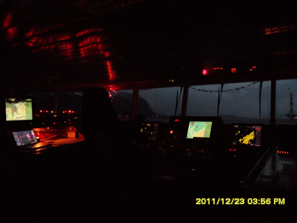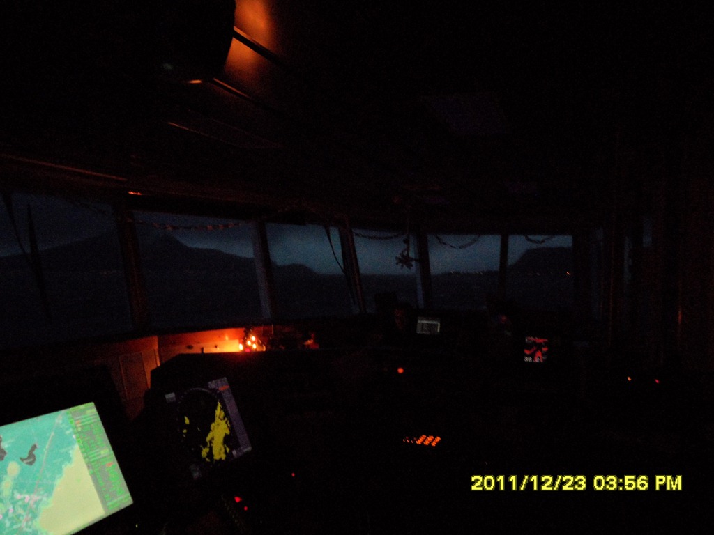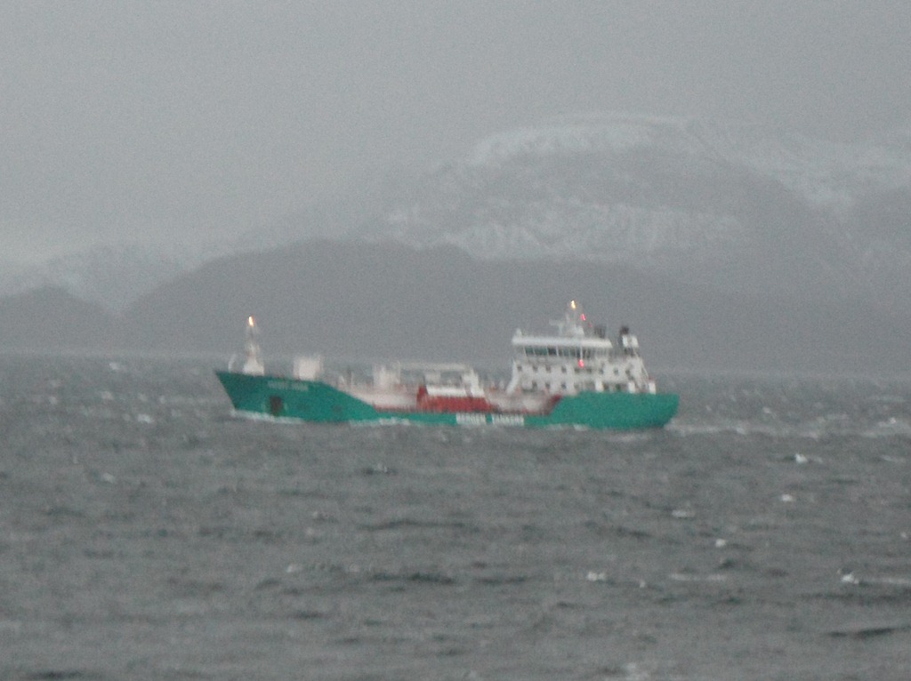 14:00 Kommer på vakt nere i Saltsteinsleia efter en dålig sömn i rullandet. Det blåser 25-28 m/s och ösregnar. Möter Bergen Viking som skall fira jul i Trondheim.