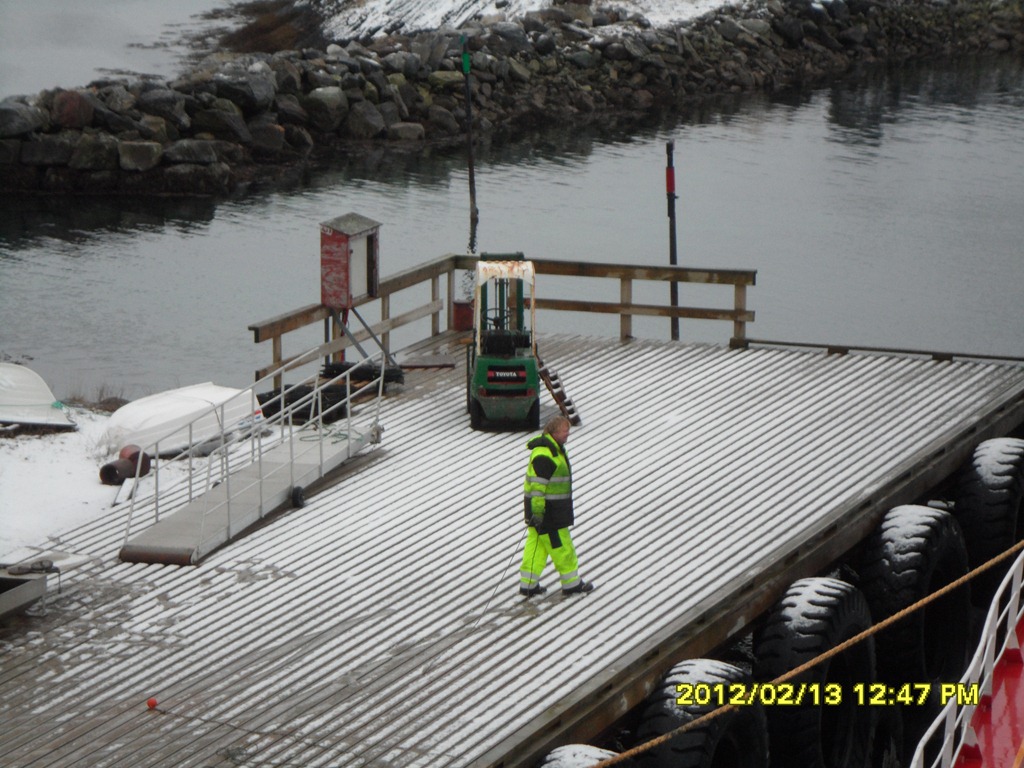 12:50 Förtöjda i Brönnöysund för sista lossningen. Freddy står på kajen och tar emot oss. Jag går iland till affären en sväng för att köpa något gott till nattvakten. ![]()