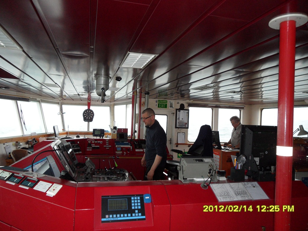 14:00 Kommer upp på bryggan igen och vi har nu kommit in i Saltsteinsleia. Det lugnar ner sig med rullandet. Vi fortsätter inöver mot Ålesund och möter Nordkapp.