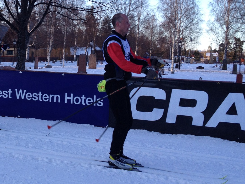 Jag kliver på bussen för att bli transporterad till Mora. Väl där så lämnar jag in mina skidor och går till bussen för transport till duscharna. När jag kliver in på den bussen så sitter Anders Karlsson där som avverkat loppet på 5:58. Han hade gått bra ända fram till Evertsberg och sedan stannat för att valla om. Men hade därmed tappat sitt glid, han stannade därför senare och tog bort fästvallan. Men annars var han nöjd.