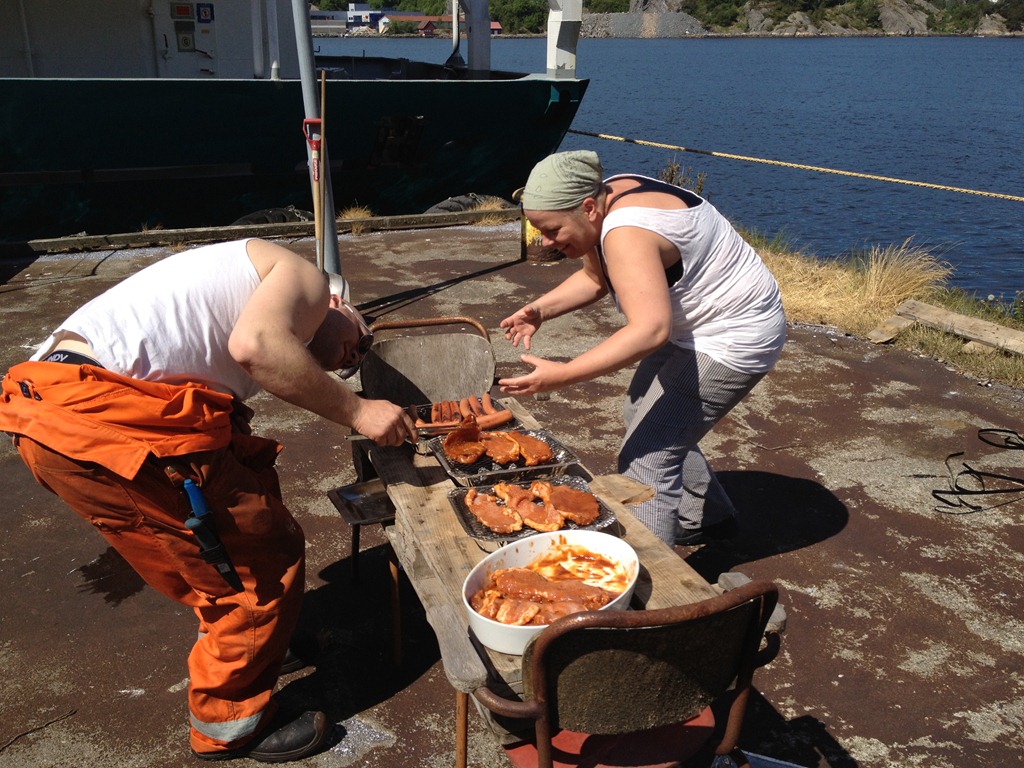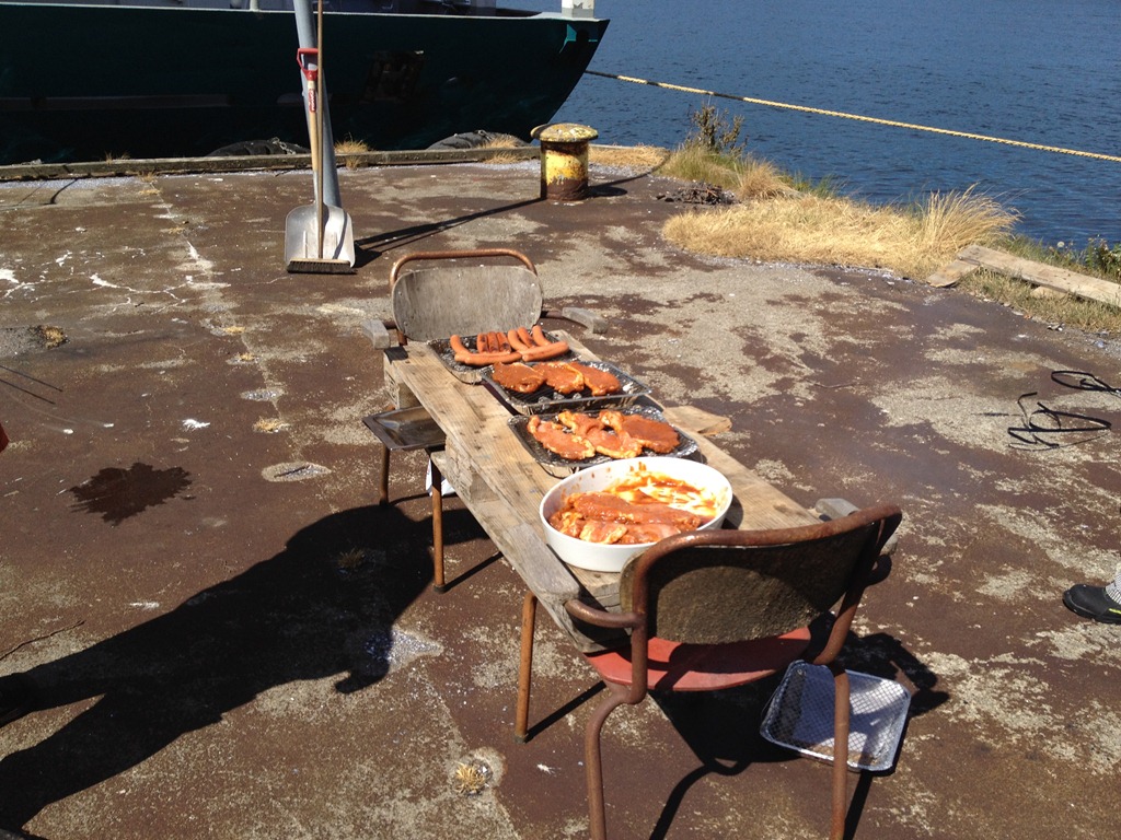 Vi dukar upp långbord på kajen och grillar till middag.