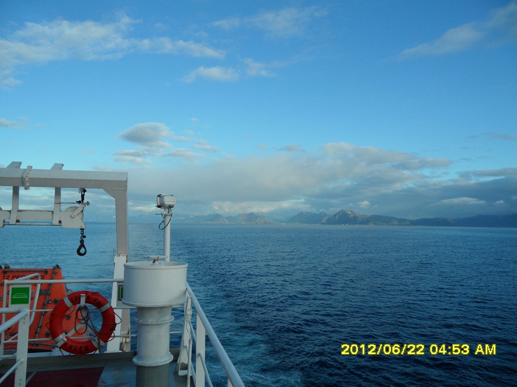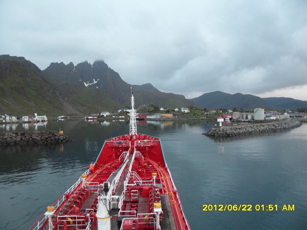 03:25 Avgår från Ballstad och går ut på Vestfjorden för att sätta kursen mot Tromsö.