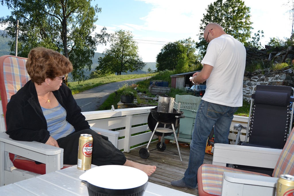 Tillbaka i stugan så grillar vi lite kött och gör en sallad samt dricker en kall öl. Utsikten från altanen är jättefin.