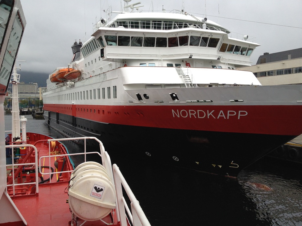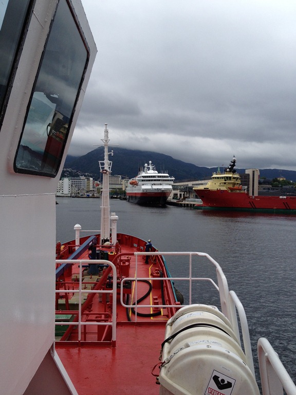 14:35 Förtöjda på utsidan Nordkapp för att bunkra. Jag går ner till Chiefen med bunkerpapper för signering.