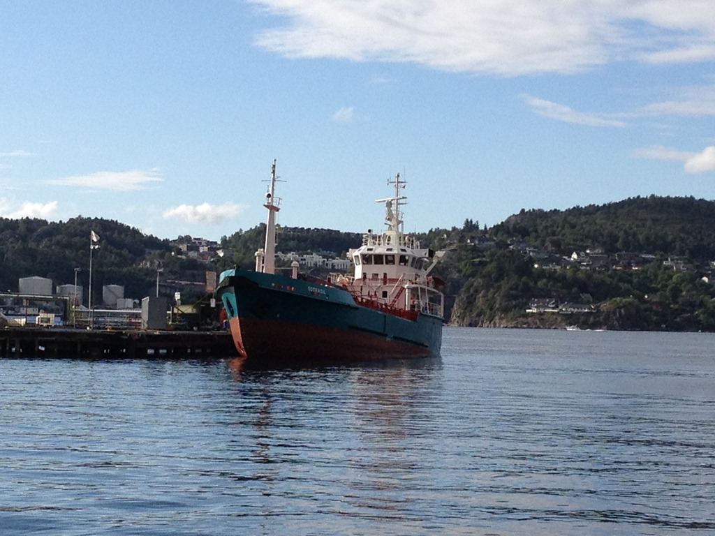 07:00 Vaknar och ser att båten vi skall bunkra är på väg in.