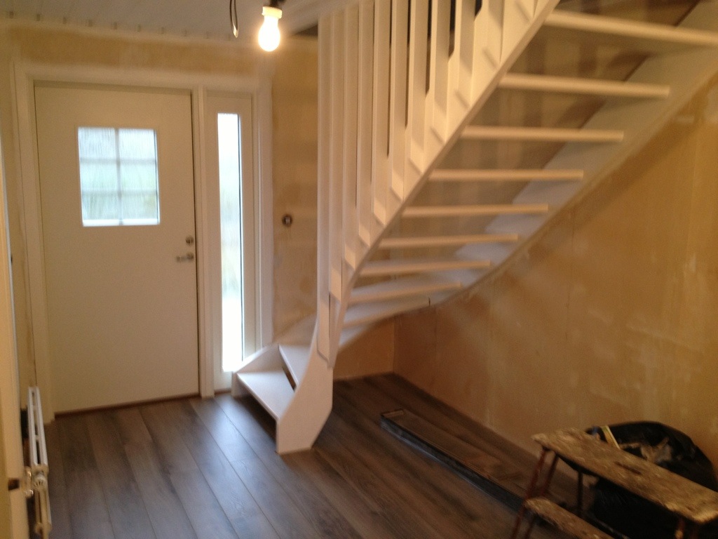 Efter frukosten så fortsatte jag lägga golv i hallen vilket ledde till att Elin vaknade. 🙂