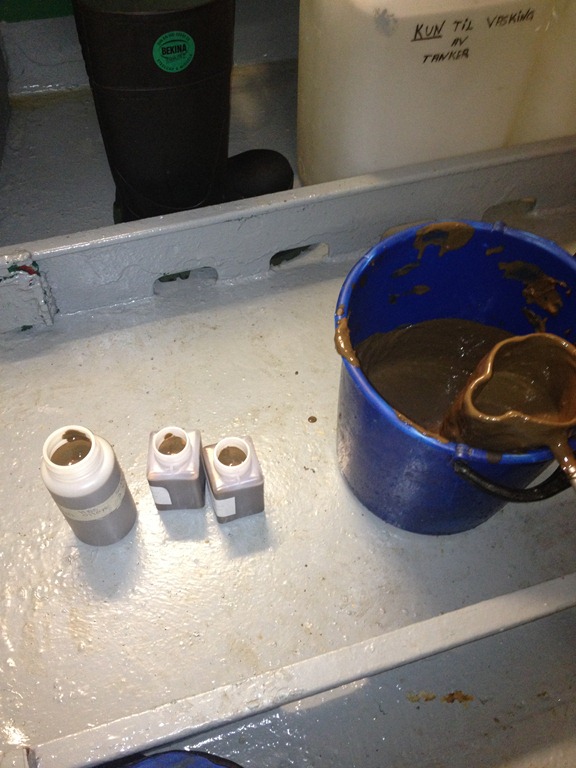14:00 Kommer på vakt och fortsätter lastningen. Jag tar lite prover av lasten och fyller på provflaskor. Väldigt tjock och trögflytande massa idag.
