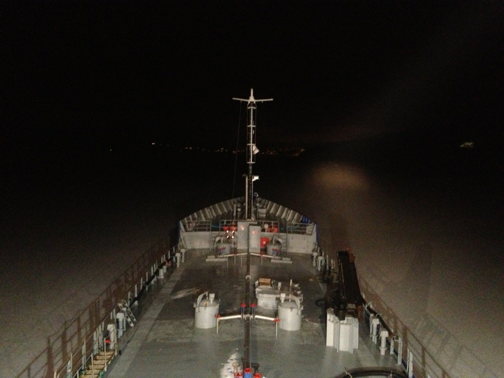 02:00 Kommer på vakt och vi är nästan framme i Bjugn. Men strax efter så kommer vi i is och farten går ner rejält. Isen är ganska tjock och vi kör fast ibland. Blir till att backa och ta fart igen.