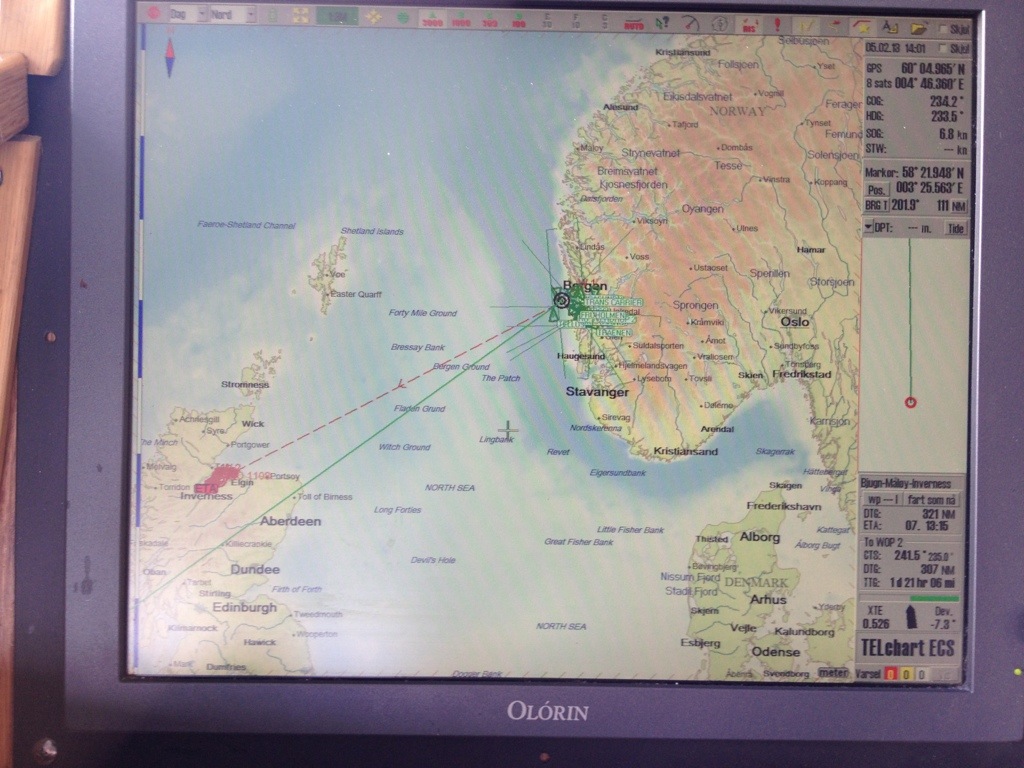 12:00 Vaknar och går ner för att ta lite kaffe. Ser att vi är på väg ut genom Korsfjorden och snart kommer passera Marsteinen. Så nu blir det öppet hav tills vi kommer över till Skottland.