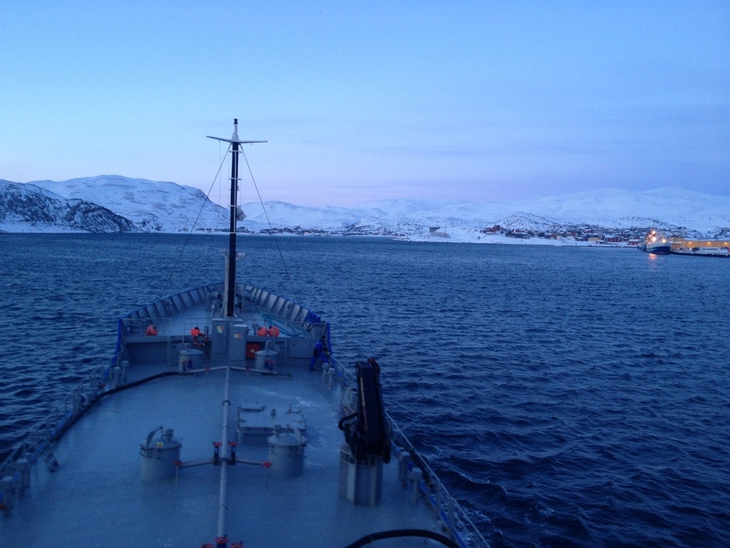 02:00 Kommer på vakt ute på Finnmarkskusten och det blåser en del. Men eftersom det är sydvästlig vind så blir det ingen sjö. Det är bra för temperaturen är bara -8 grader.