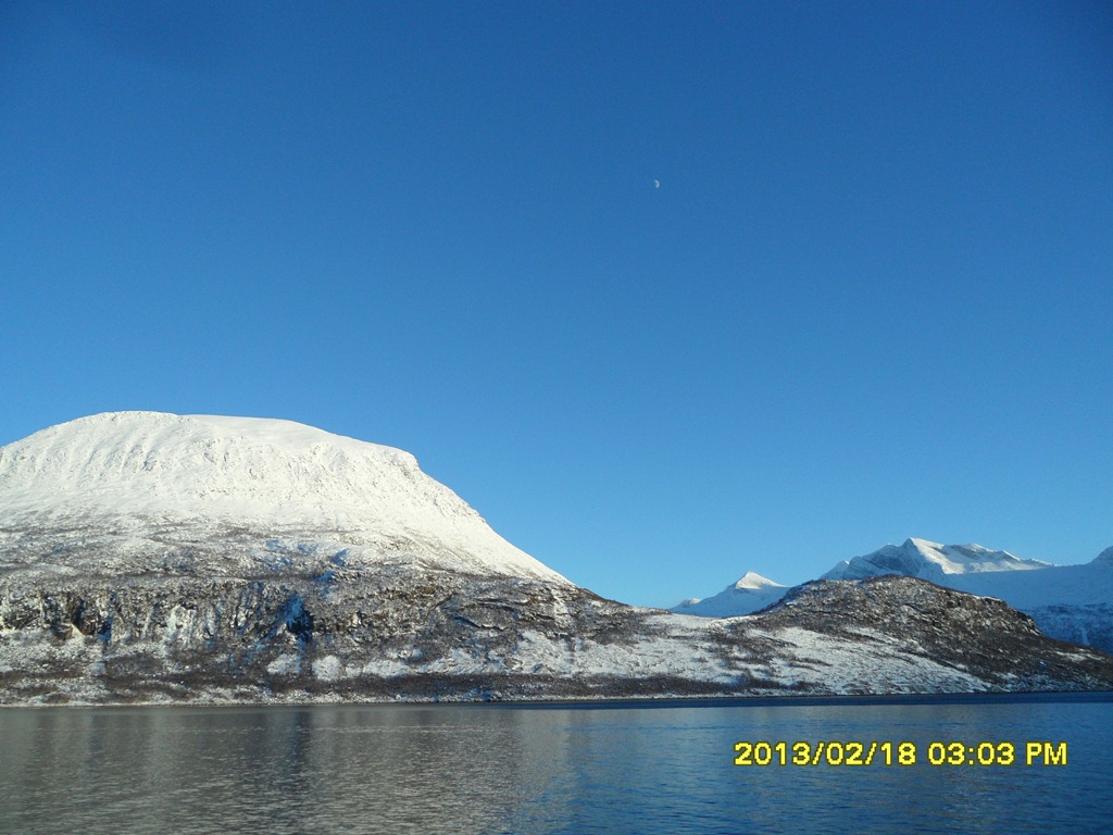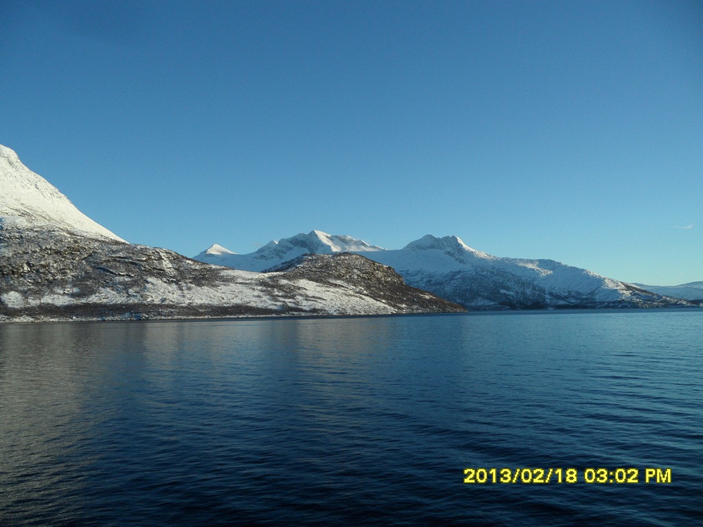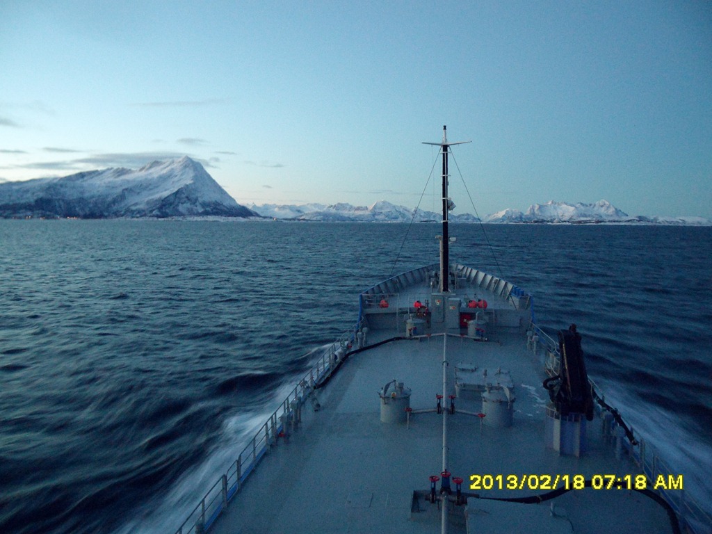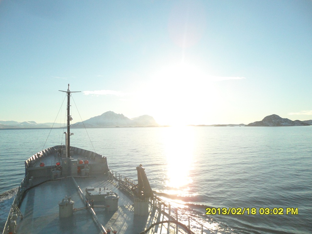 02:00 Kommer på vakt när vi lämnar Vestfjorden och sätter kursen söderut. Vi passerar Bodö i fint stilla väder och +1 grad.