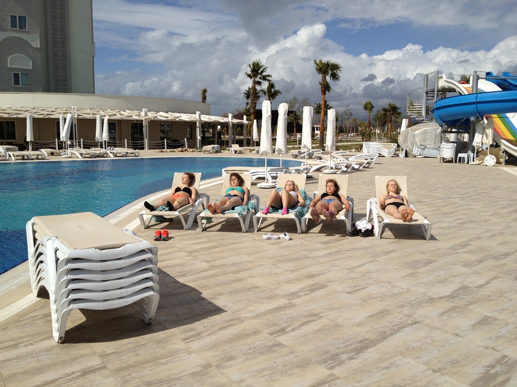 På kvällen så blev det en god middag innan vi skulle lägga oss. Men tyvärr så fick Erika näsblod och spräckte en blodåder. Det slutade inte blöda så Britta och Frida fick följa med henne i ambulans in till Side där de brände blodkärlet för att få stopp på blödningen. Det blev en kostsam historia på nästan 6000 kronor. Men Britta hade med sig kortet och kunde lösa ut dem. Sedan fick de skjuts med ambulansen ner till hotellet igen så vi kunde hinna med bussen i natt.