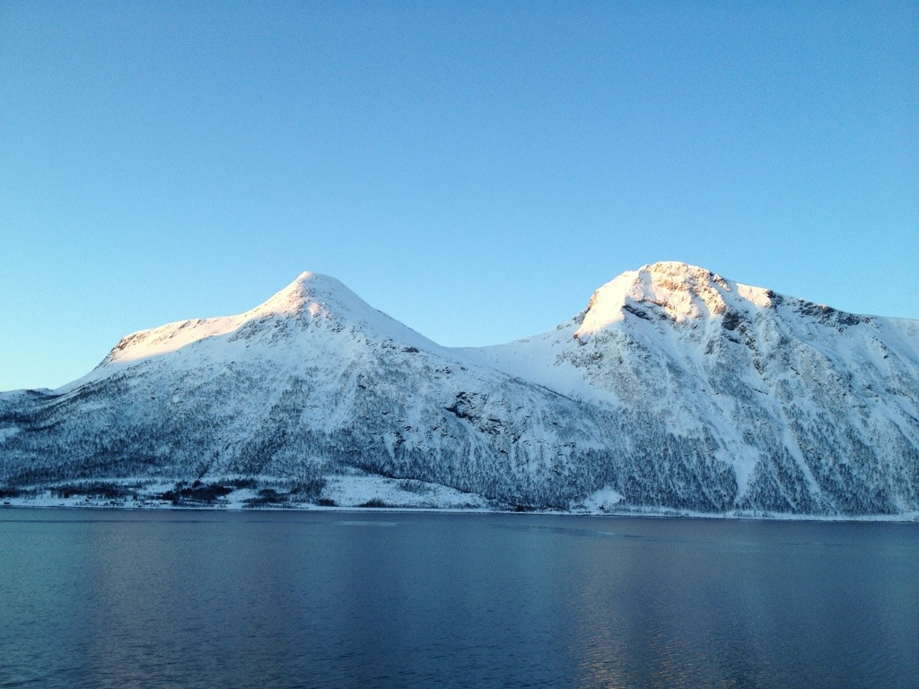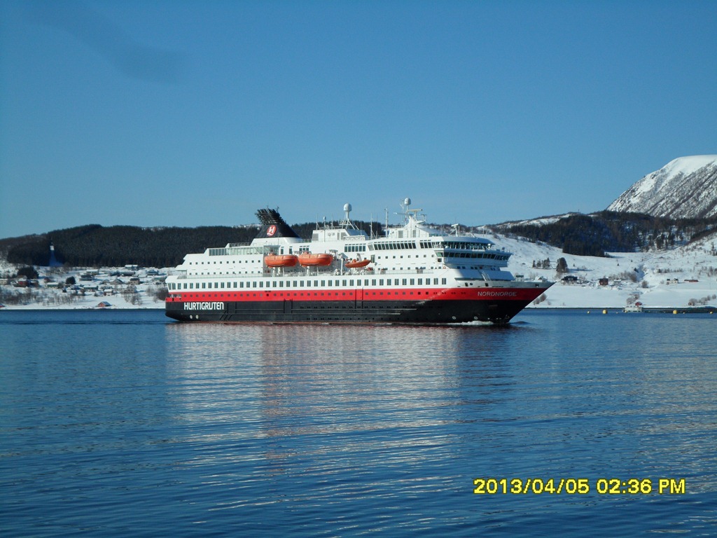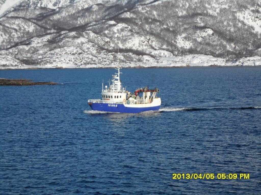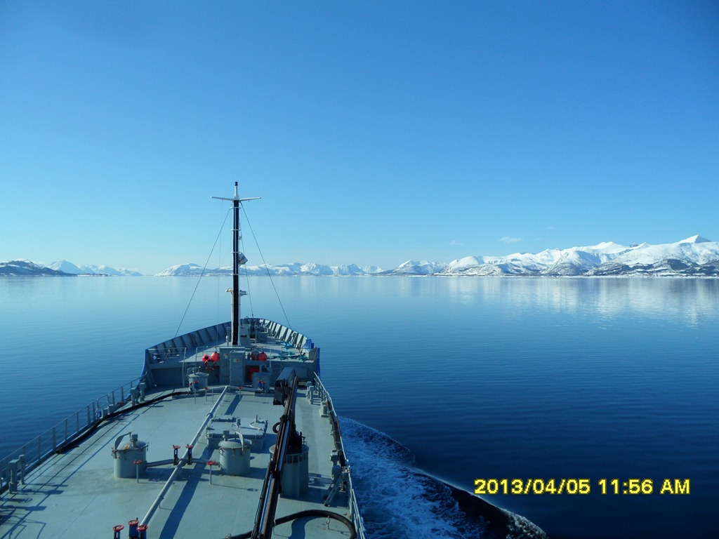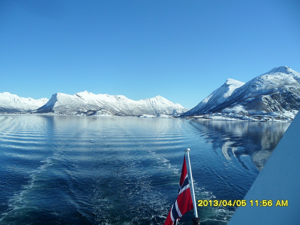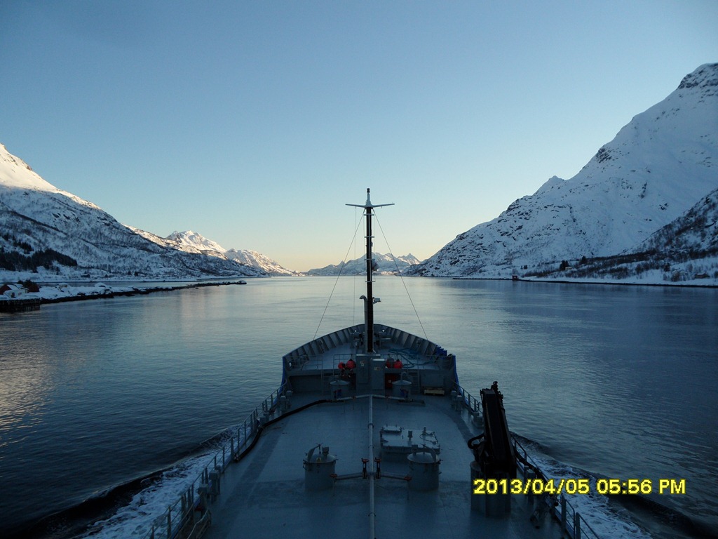 12:30 Färdig lastade och avgår mot Stokmarknes. Solsken och stilla blek -4 grader.