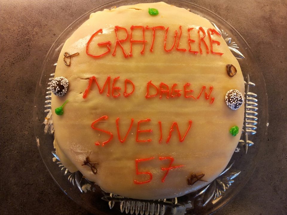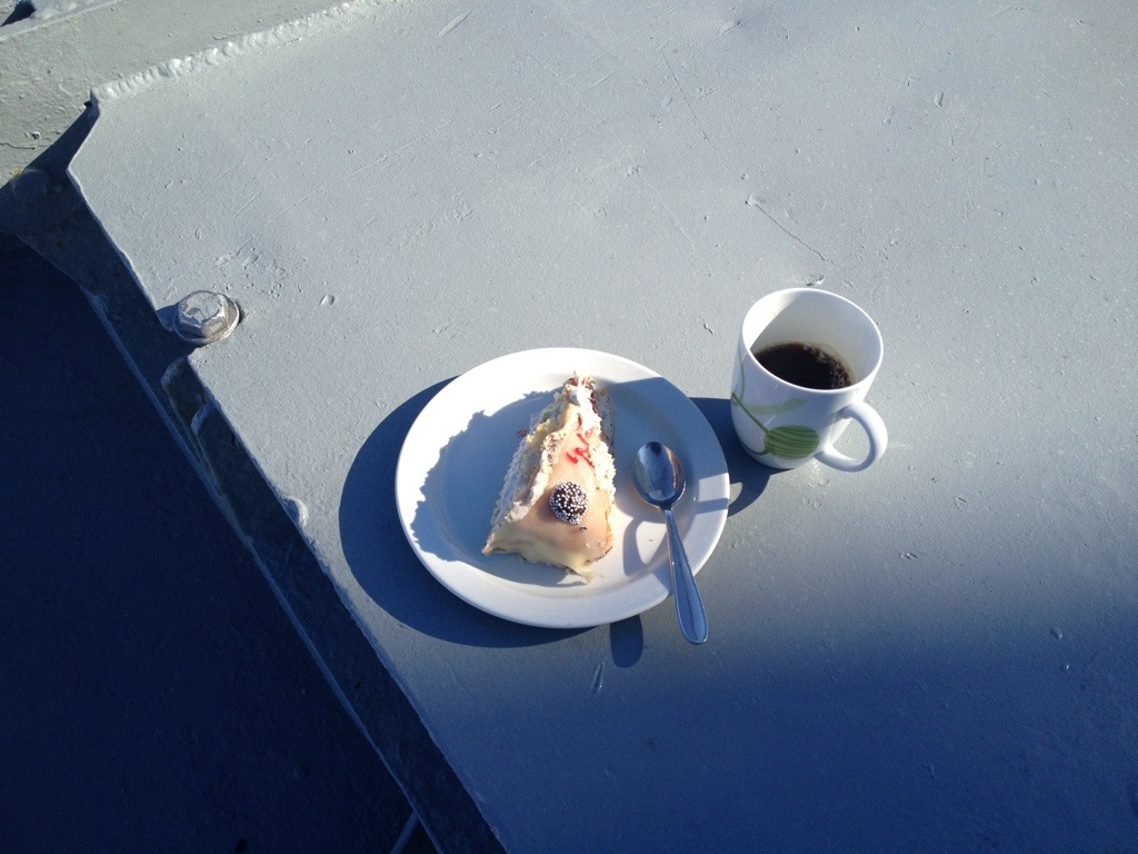 Kapten Svein fyller år idag så kocken har bakat tårtor. Så vi sätter oss i solskenet på däck och äter lite.![]()