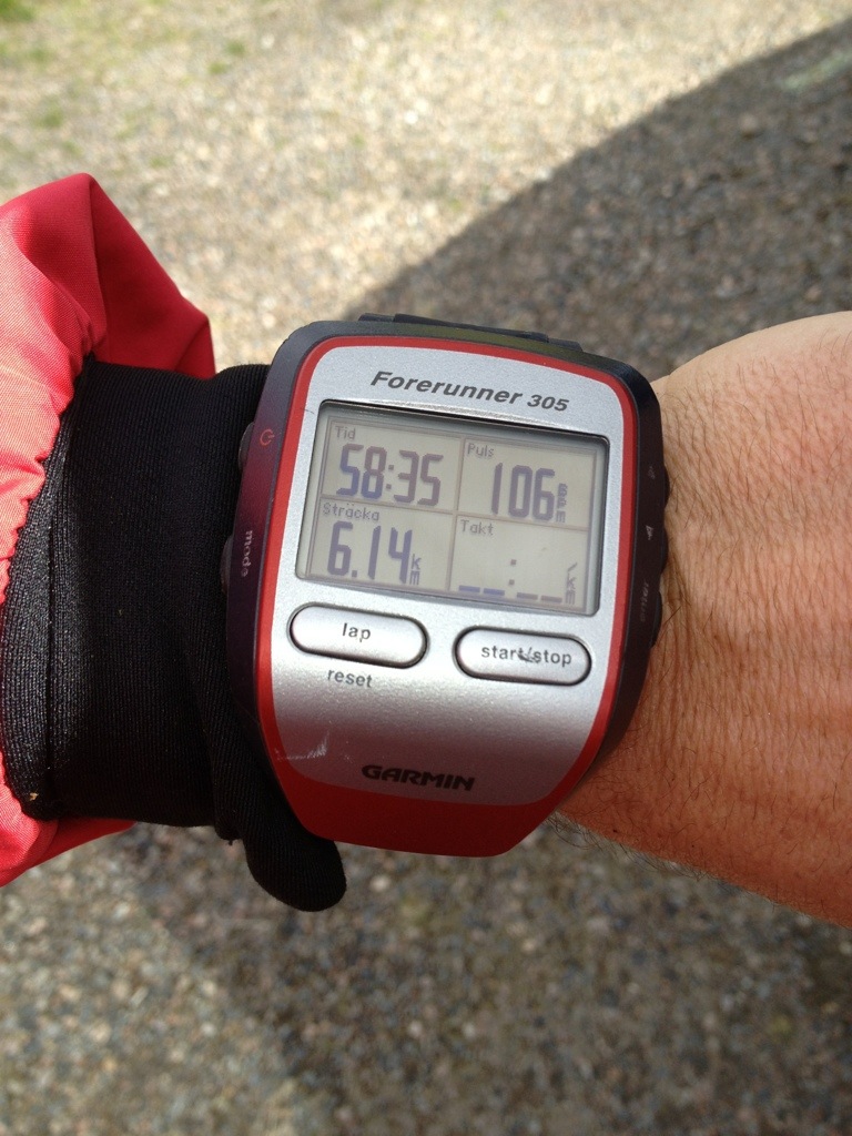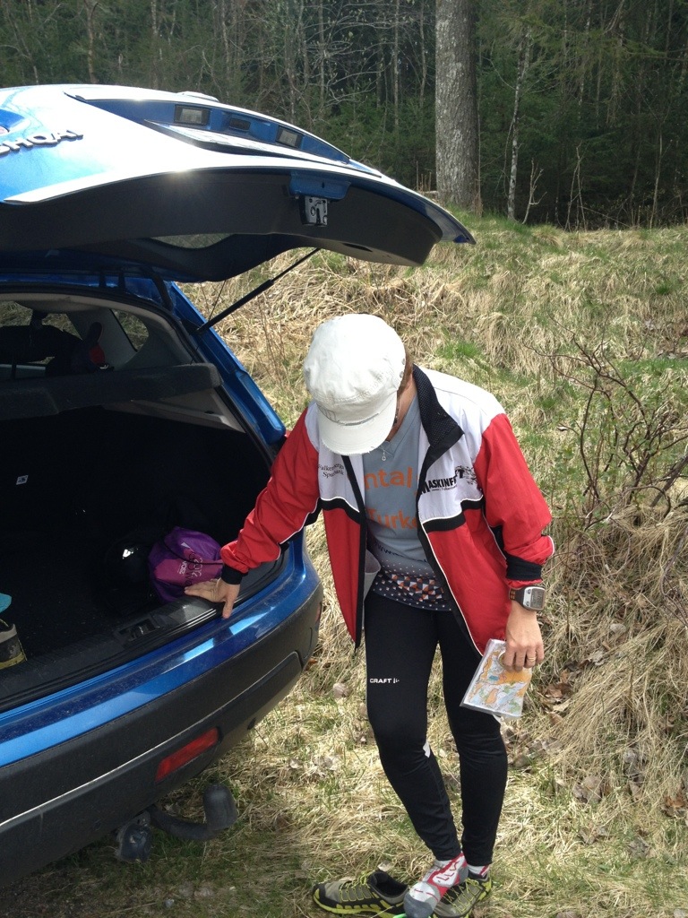 Vi joggade ca 1 km bort till startpunkten. Sedan sprang vi våra banor. Det tar ju lite längre tid när det bara sitter en liten träpinne ute i skogen.
