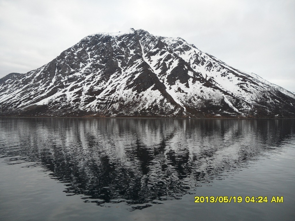 Fortsätter österut genom Magerøysundet och förbi Honningsvåg . Stilla väder men mulet och +6 grader.