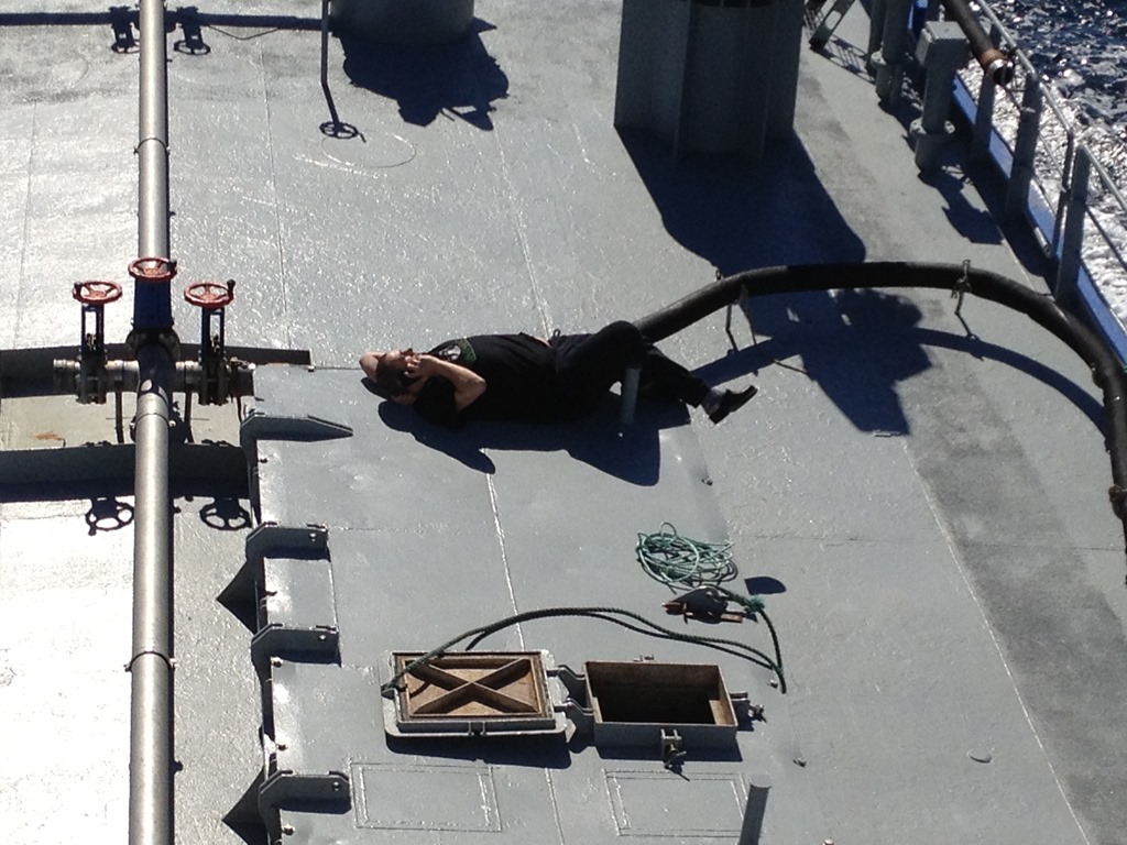 12:00 Vaknar och som igår så går jag ut i solskenet på däck och dricker lite kaffe.