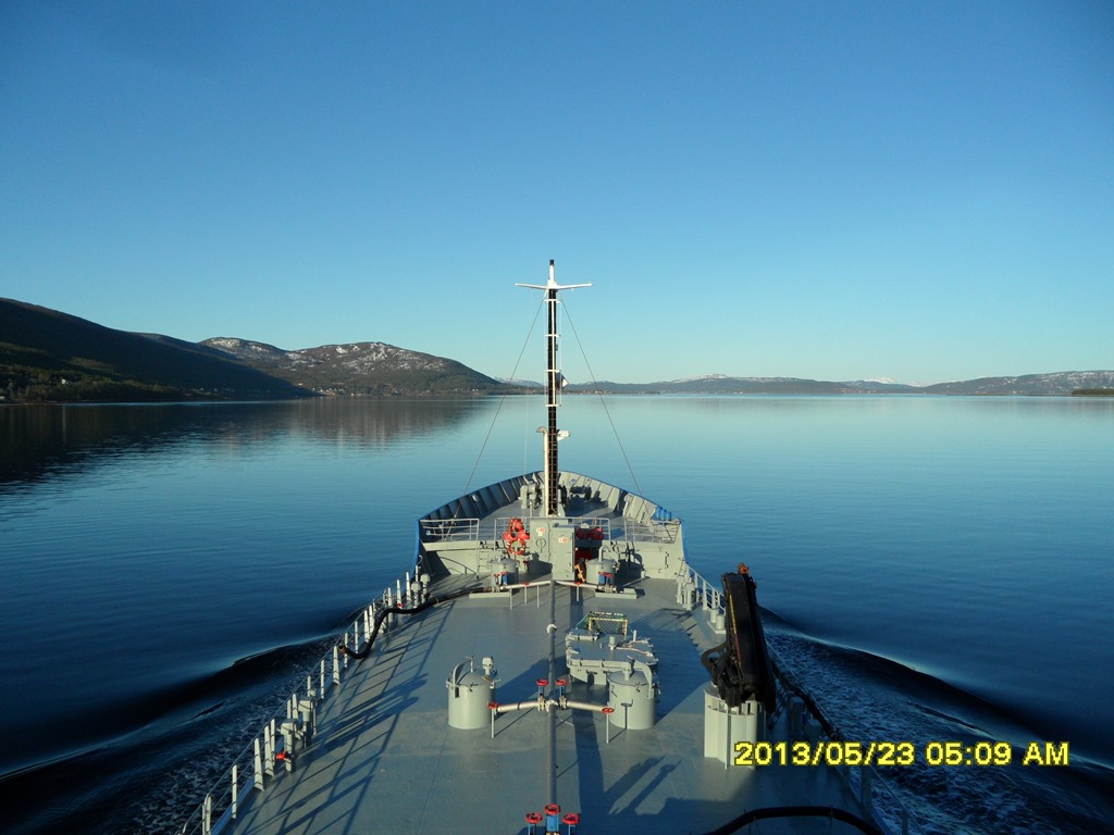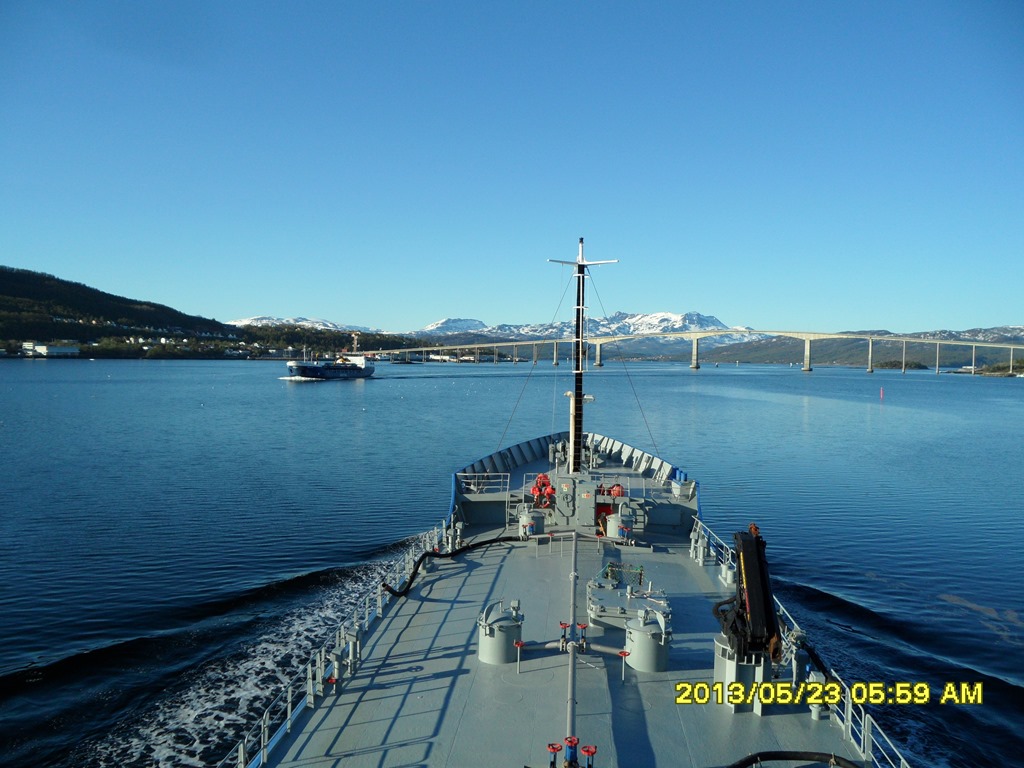 02:00 Kommer på vakt när vi passerar Tromsö. Sätter mig med kaffe och fortsätter ner mot Rystraumen där vi möter Martin H och Kystvaktskipet Svalbard.