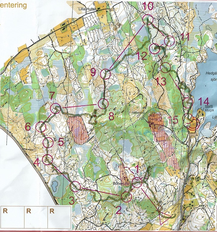 13:e Ut till vägen igen och tänkte ta kompass rätt ner mot kontrollen men det var för tätt så jag fortsatte en bit längs grönområdet tills det gick att ta sig igenom. Väl igenom så var det bara rätt över mossen till kontrollen.