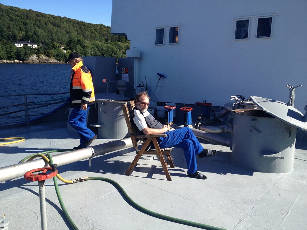 08:00 Börjar lossa lasten i solskenet, men det är fortfarande bara 10 grader och blåser Nordostlig vind 6-9 m/s. Men så fort vinden börjar mojna så kommer skepparn ut och sätter sig i solstolen.